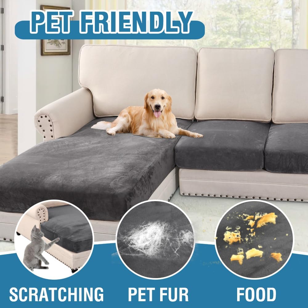 - INCREDIBLY COMFORTABLE VELVET: Products passed GLOBAL RECYCLED STANDARD certificate.This innovated stretch sofa slipcovers are constructed with 3 PIECES,including 1 Chaise cover and 2 individual cushion covers. Crafted from luxurious velvet plush fabric, feature thick, soft, smooth, anti-wrinkle, no fading, durable as well as highly stretch. Protect your cushion furniture from daily wears and tears, stains, kids, scratches from pet claws, dogs or accidental spills