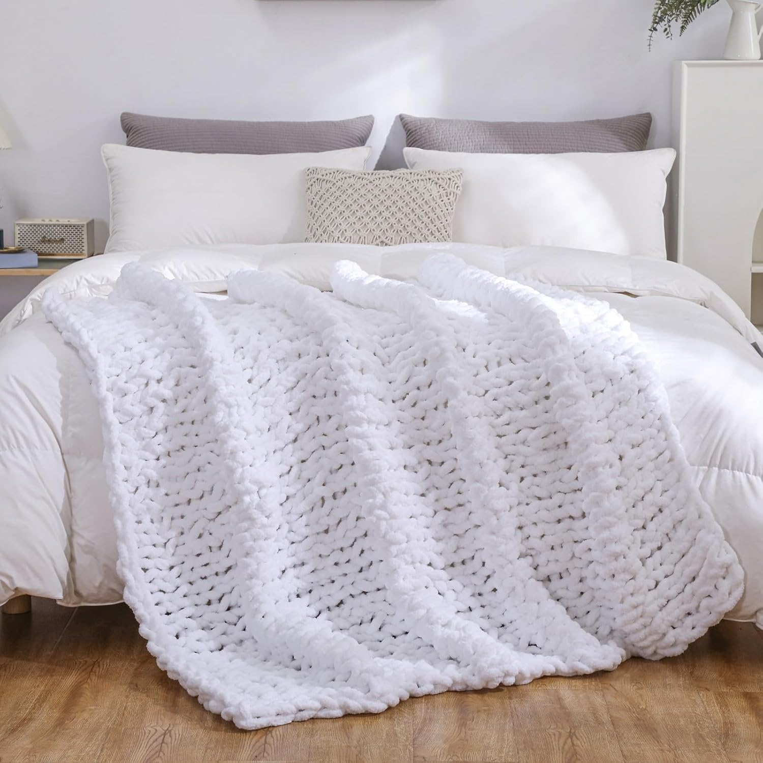 WESHIONGOO Chunky Knit Blanket Throw Knitted Throw Blankets for Couch Bed Fluffy Soft Blanket with Jumbo Chenille Yarn Thick 100% Handmade (White, 50"×60")