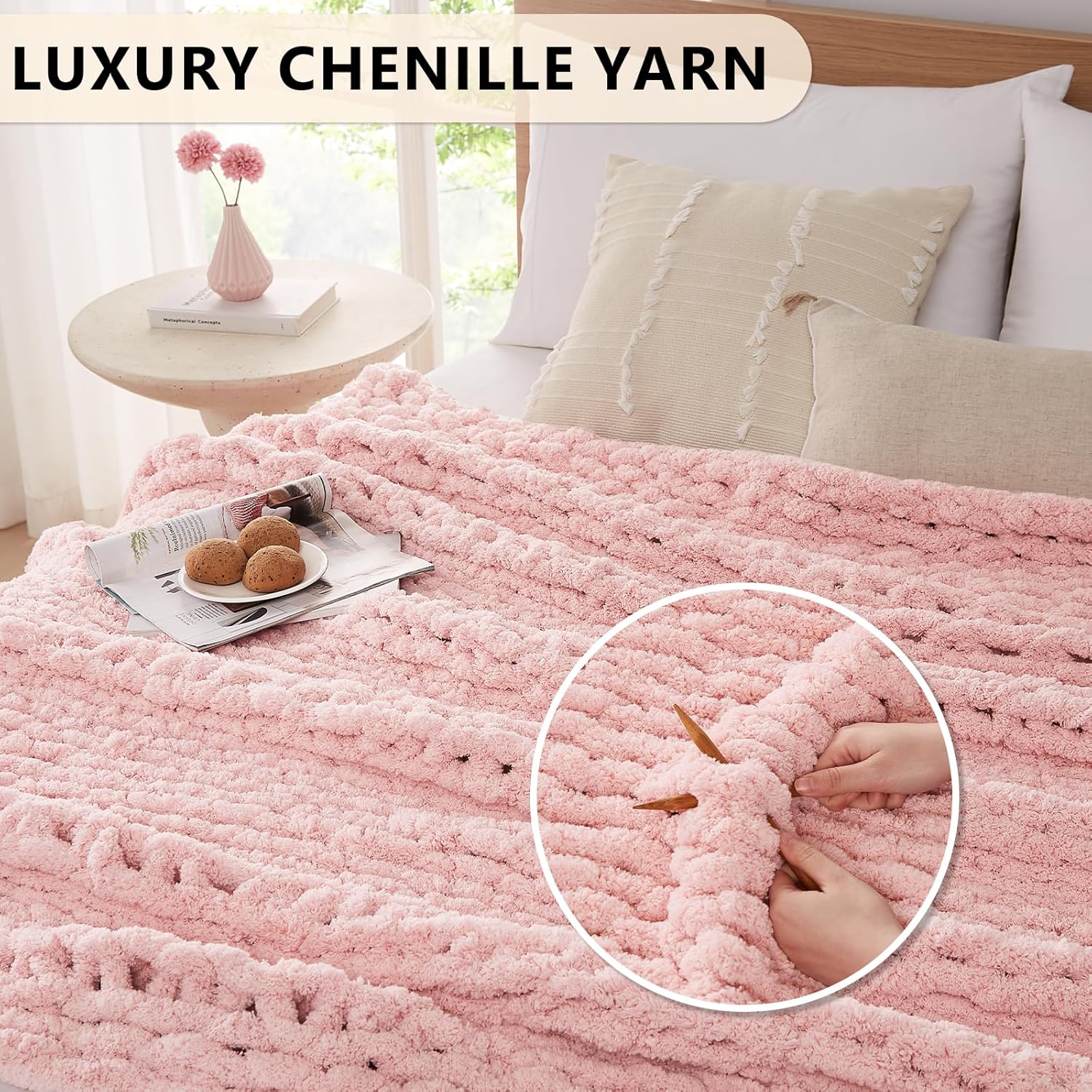 L'AGRATY Chunky Knit Blanket Throw - Soft Chenille Yarn Throw Blanket 40x50: Handmade Thick Knit Crochet Blanket - Large Chunky Rope Pink Throw Blanket for Couch Sofa Bed Home Decor