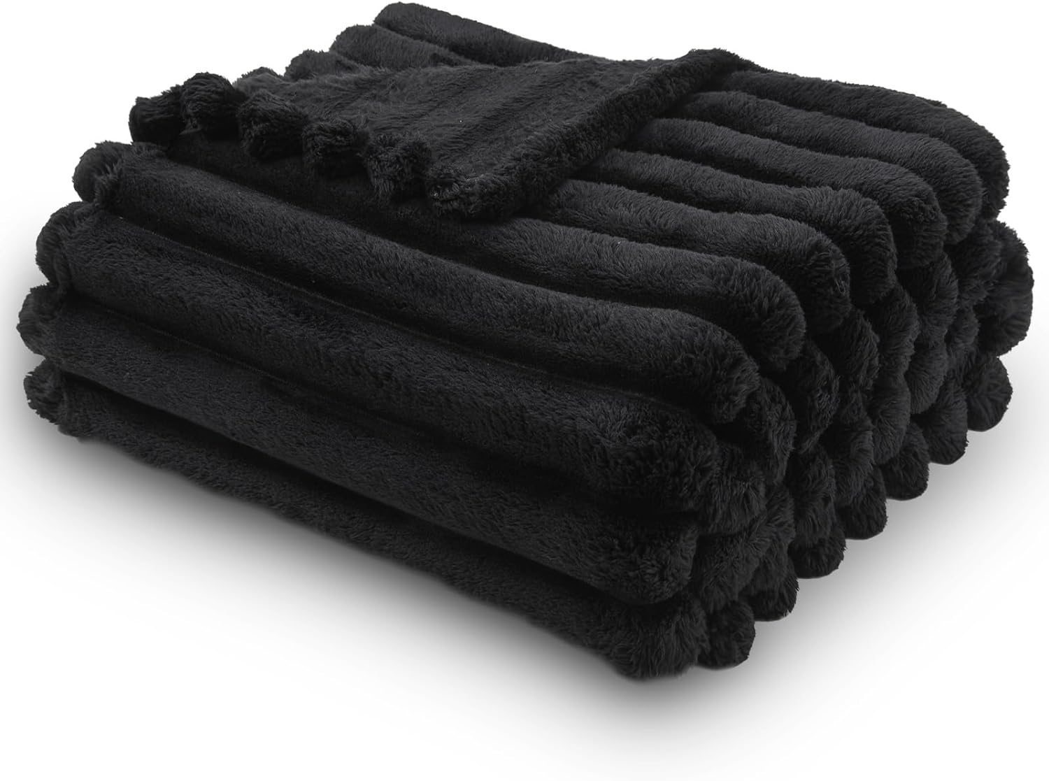 NEWCOSPLAY Super Soft Throw Blanket Black Premium Silky Flannel Fleece 3D Ribbed Jacquard Lightweight Bed Blanket All Season Use (Black Ribbed, Throw(50"x60"))