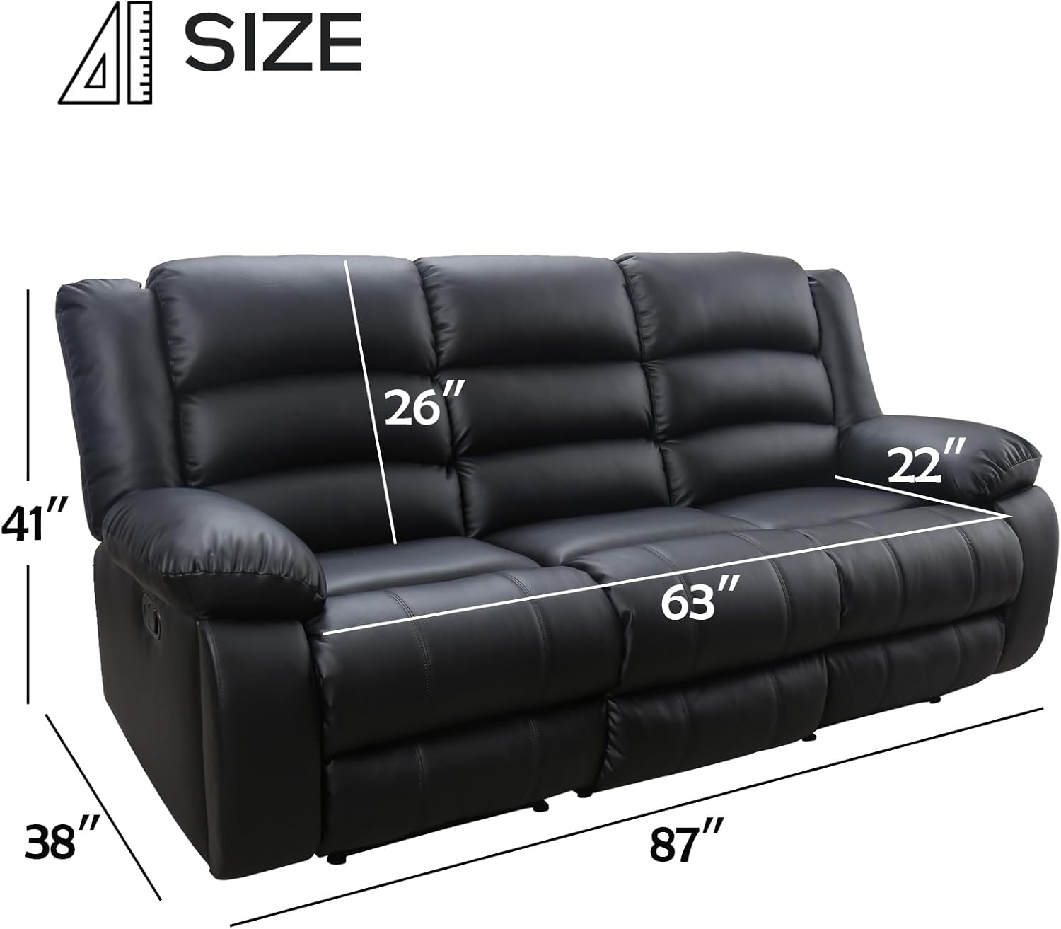 EBELLO Faux Leather Manual Reclining Sofa with 2 Concealed Cup Holders, Overstuffed Armrest 3 Seat Recliner Couch for Living Room, Bedroom, Meeting Room, Black