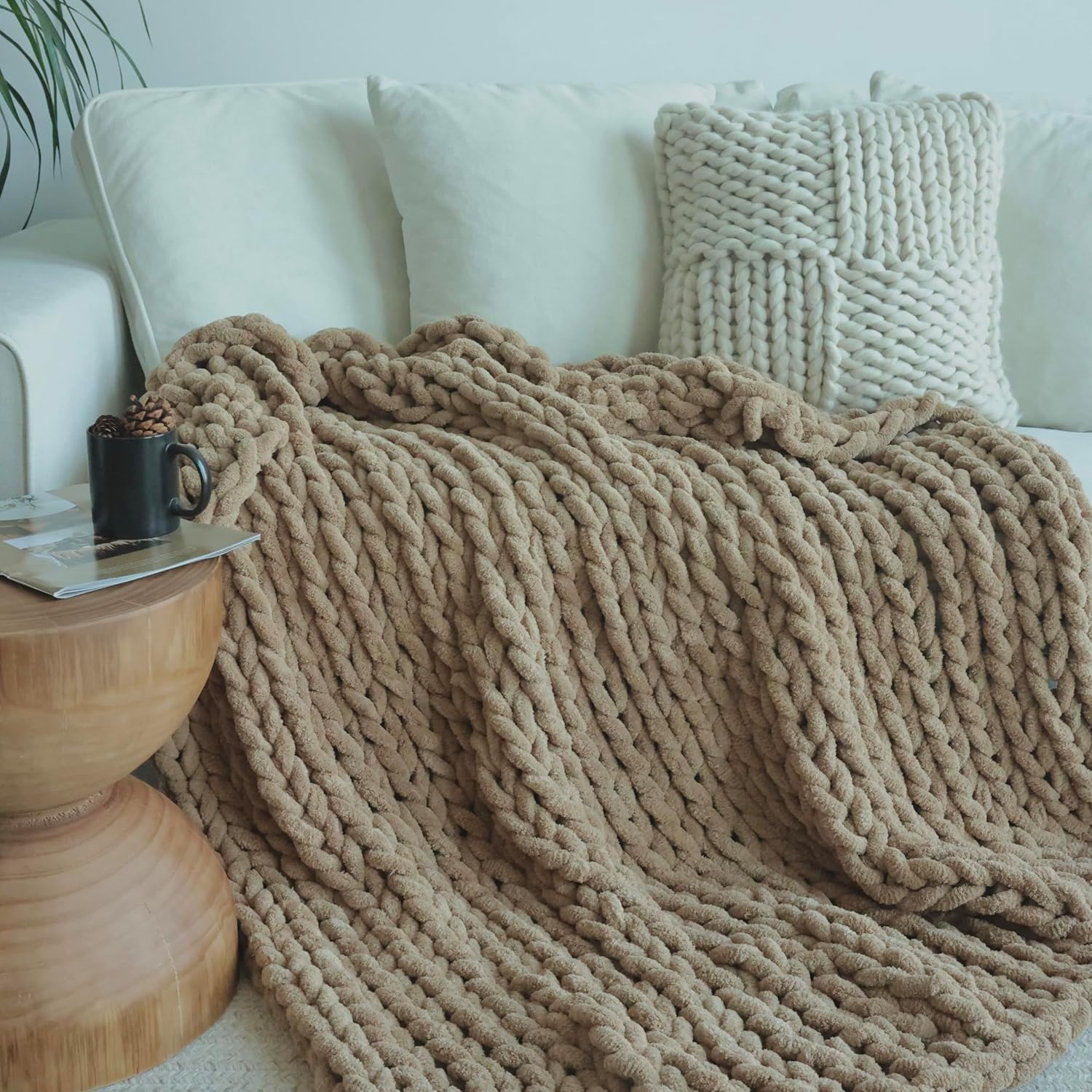Maetoow Chenille Chunky Knit Blanket Throw (40×50 Inch), Handmade Warm & Cozy Blanket Couch, Bed, Home Decor, Soft Breathable Fleece Banket, Christmas Thick and Giant Yarn Throws, Khaki