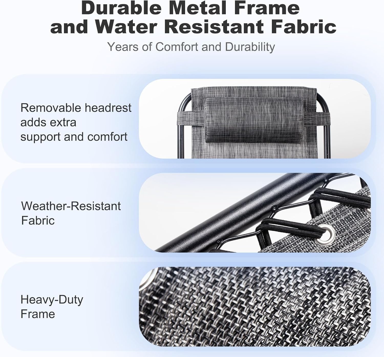 - RELAX IN STYLE: Our Zero Gravity Lounge Chair Recliners are designed to provide the ultimate in comfort and style, with a sleek black steel mesh design that looks great in any outdoor setting.