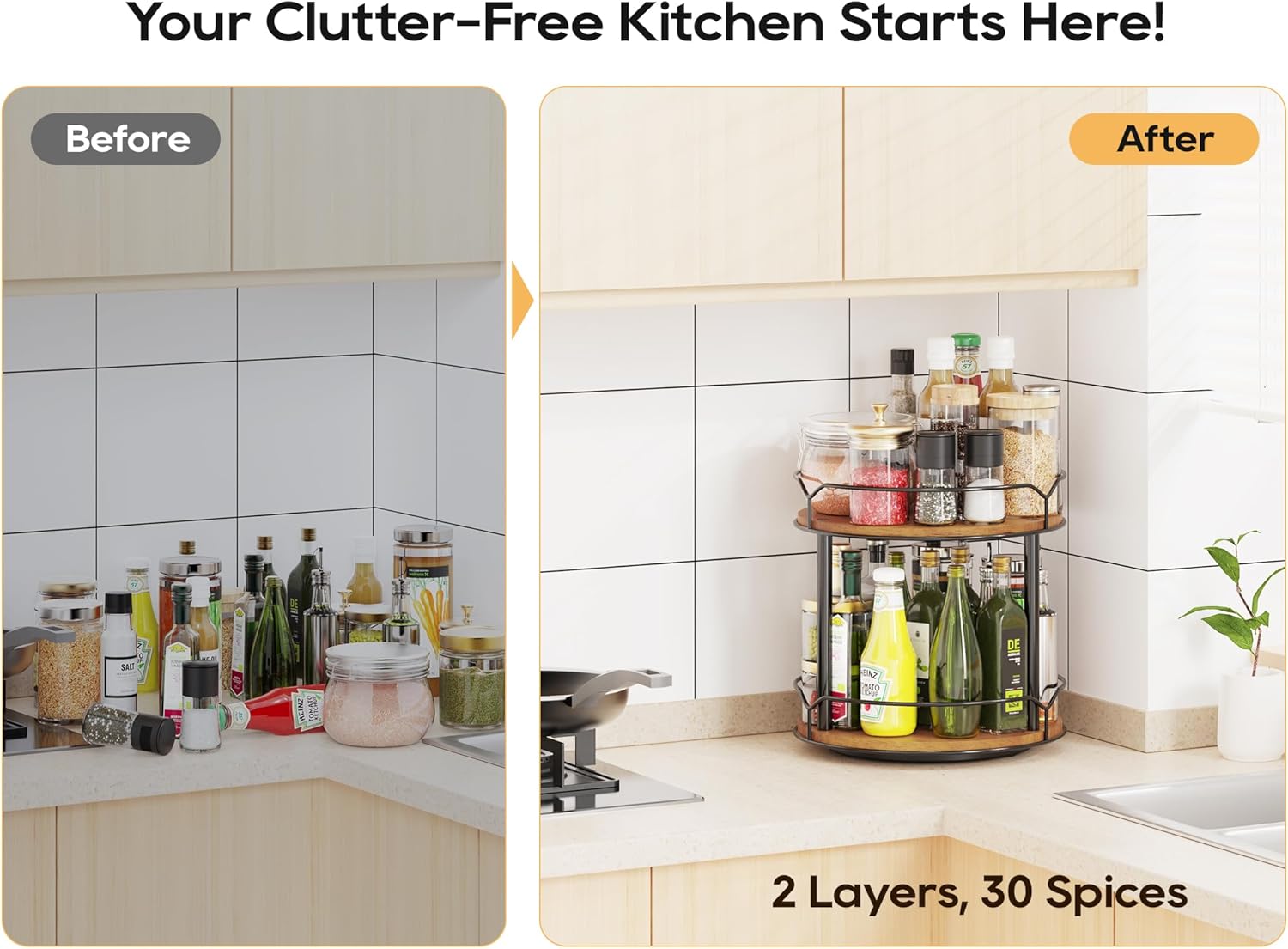 - 2. Efficient Design for Easy Access: Whether you're grabbing your favorite spices or toiletries, our Lazy Susan organizer makes it easy. The two-tier design allows for efficient storage, while the rotating design ensures easy access to all your items