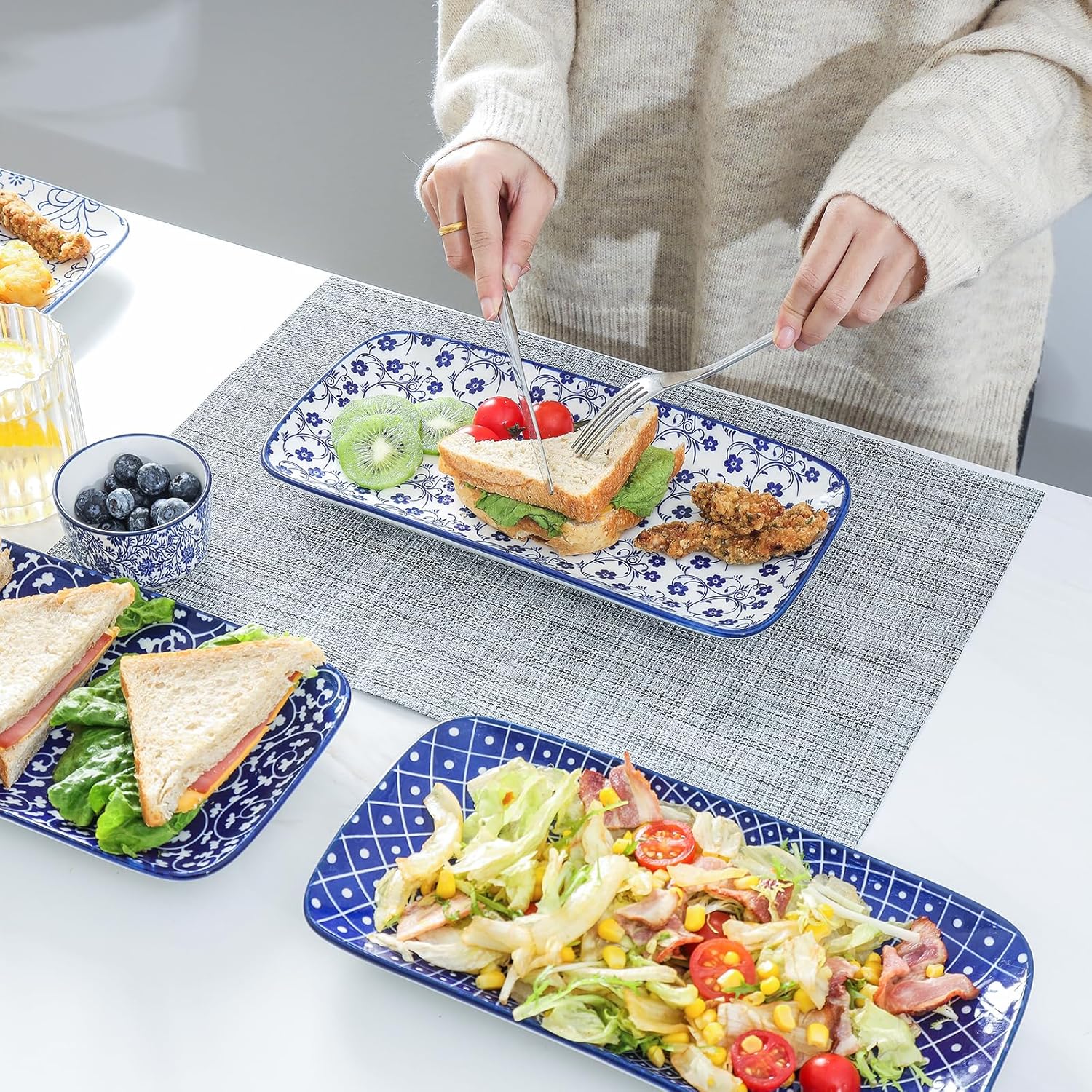 Selamica Ceramic Serving Platters, 14 Inch Serving Trays for Party Entertaining, Large Rectangular Serving Plates for Appetizer, Charcuterie, Dessert, Fruit, Set of 4, Vintage Blue