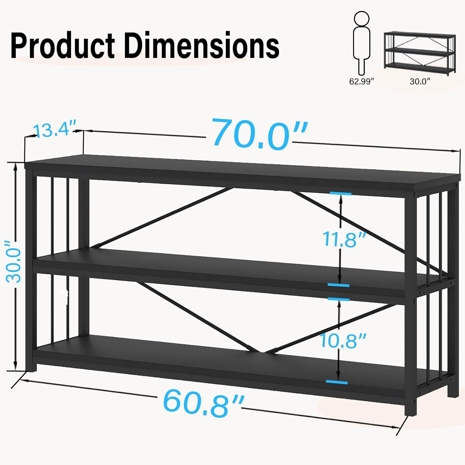 - Unveiling the Multi-Tier Display Marvel: With its generous 70-inch expanse, this 3-tier black sofa table offers an expansive platform for showcasing your prized items. Elevate the allure of your living room, foyer, or entryway as you effortlessly blend functionality and elegance in one exquisite piece.