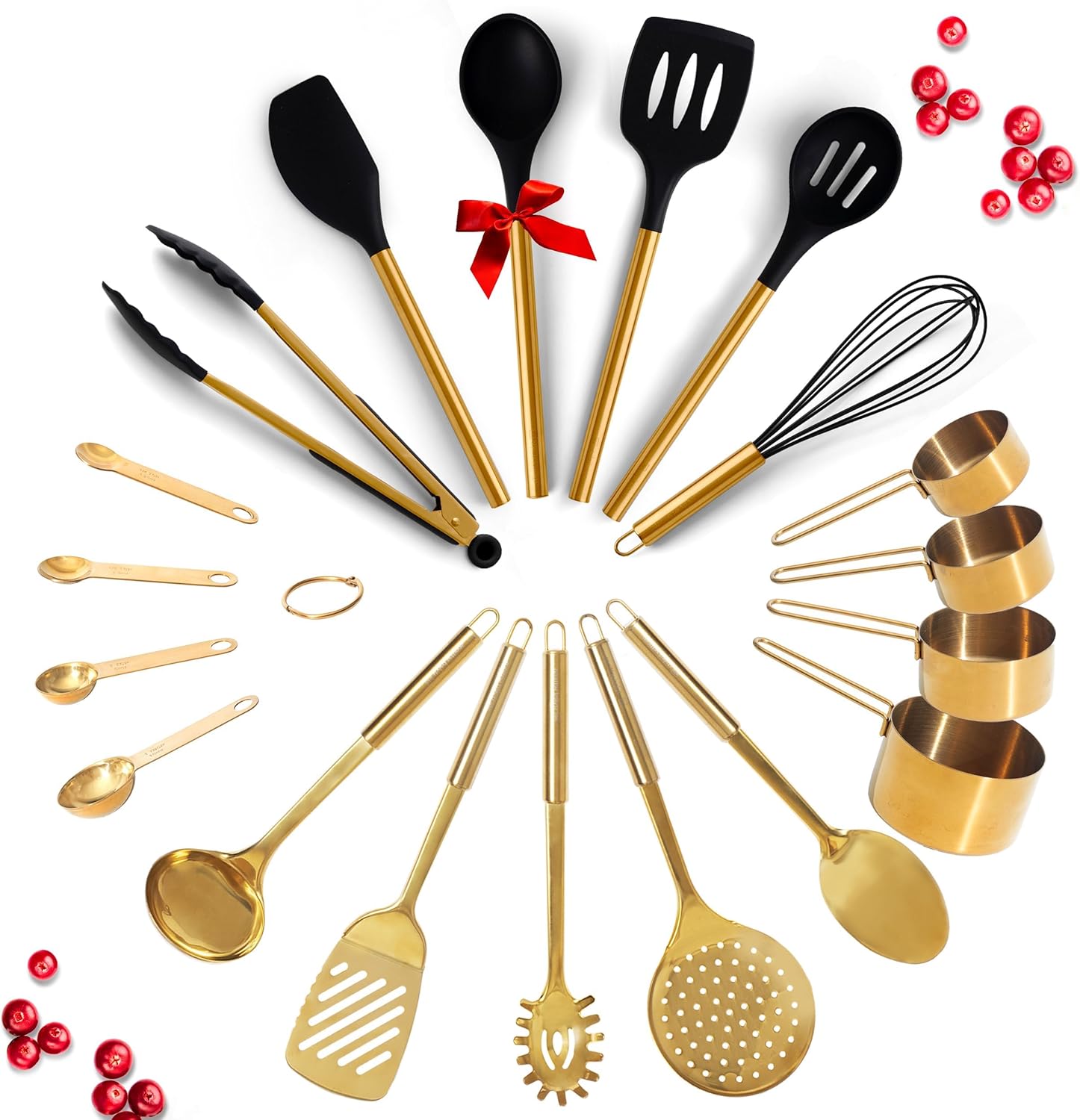 - ✔ ADD GLAMOR TO YOUR KITCHEN WITH THIS COMPLETE GOLD KITCHEN UTENSILS - instantly elevate your cooking and baking experience by adding this 19-piece set of gold cooking utensils, black kitchen utensils, & gold measuring cups and spoons. Contents include a gold spoon, pasta serving fork, slotted gold spatula, kitchen skimmer, gold ladle, black silicone spatula, slotted silicone turner, basting spoon, silicone whisk, gold tongs, gold measuring cups, and gold measuring spoons