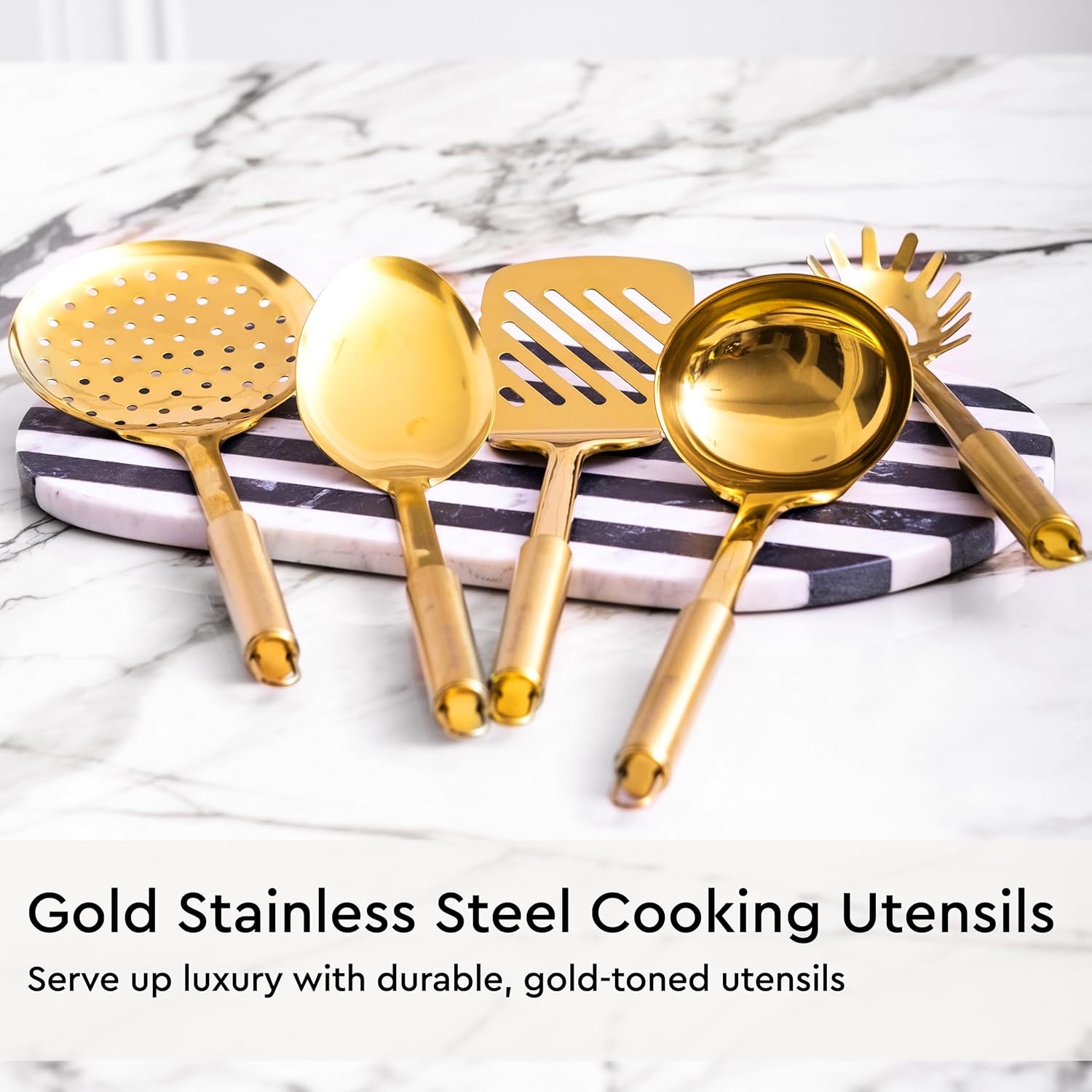 - ✔ MAKES A GREAT PRESENT - Delight in gifting our titanium-coated gold serving utensils set, where functionality meets sophistication. Ideal for both excellent cooking and serving in style, this high-class gold stainless kitchen utensils set brings a touch of luxury to any kitchen. An exceptional gold kitchen accessories set that’s as stylish as it is practical, making it an ideal contemporary gift