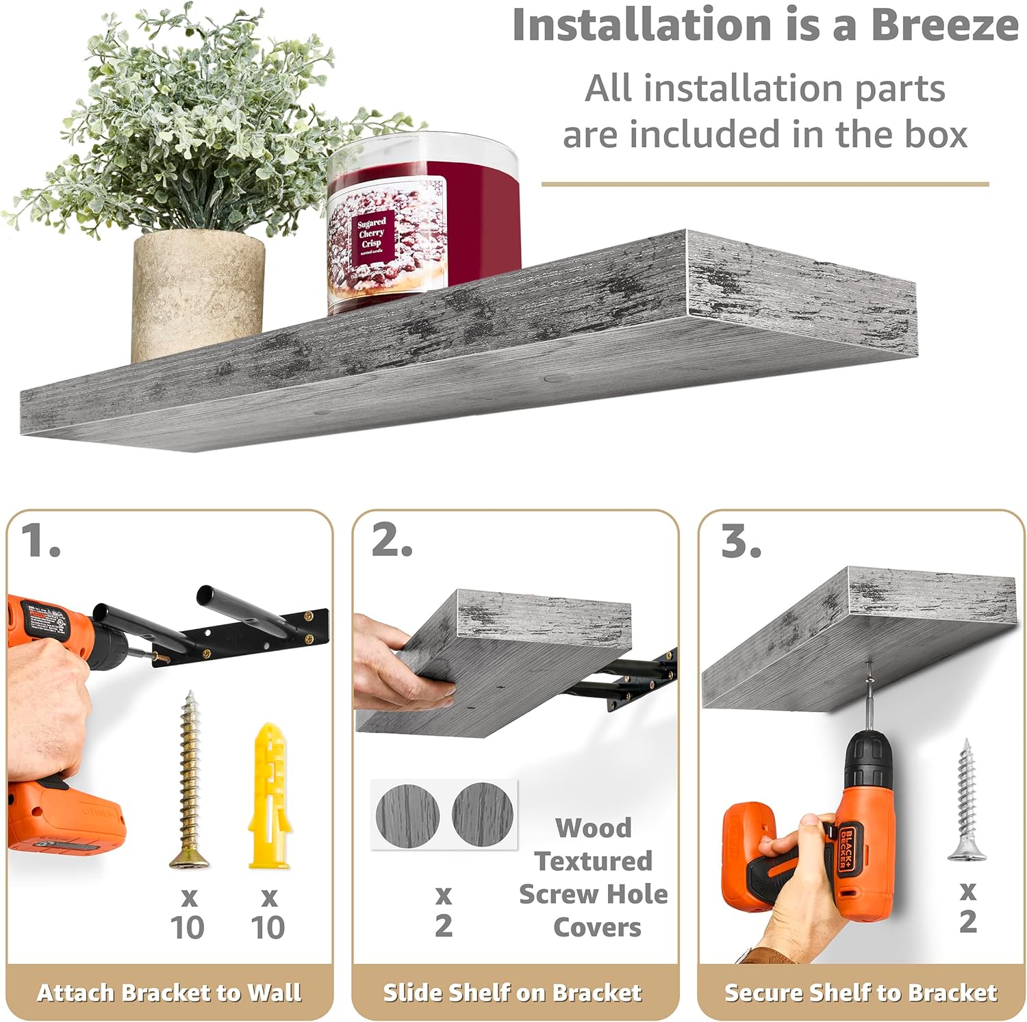 - Easy to Install: Minor assembly required, detailed instructions included - Sorbus Wall Floating Shelves are made of beautiful engineered faux wood (not solid wood) - Feature a smooth matte finish - Enhanced steel brackets attach firmly to the wall without visible support - Sturdy enough to hold up to 22 lbs - Mounting Hardware INCLUDED - Color may be slightly different from the pictures depending on lighting and/or screen settings