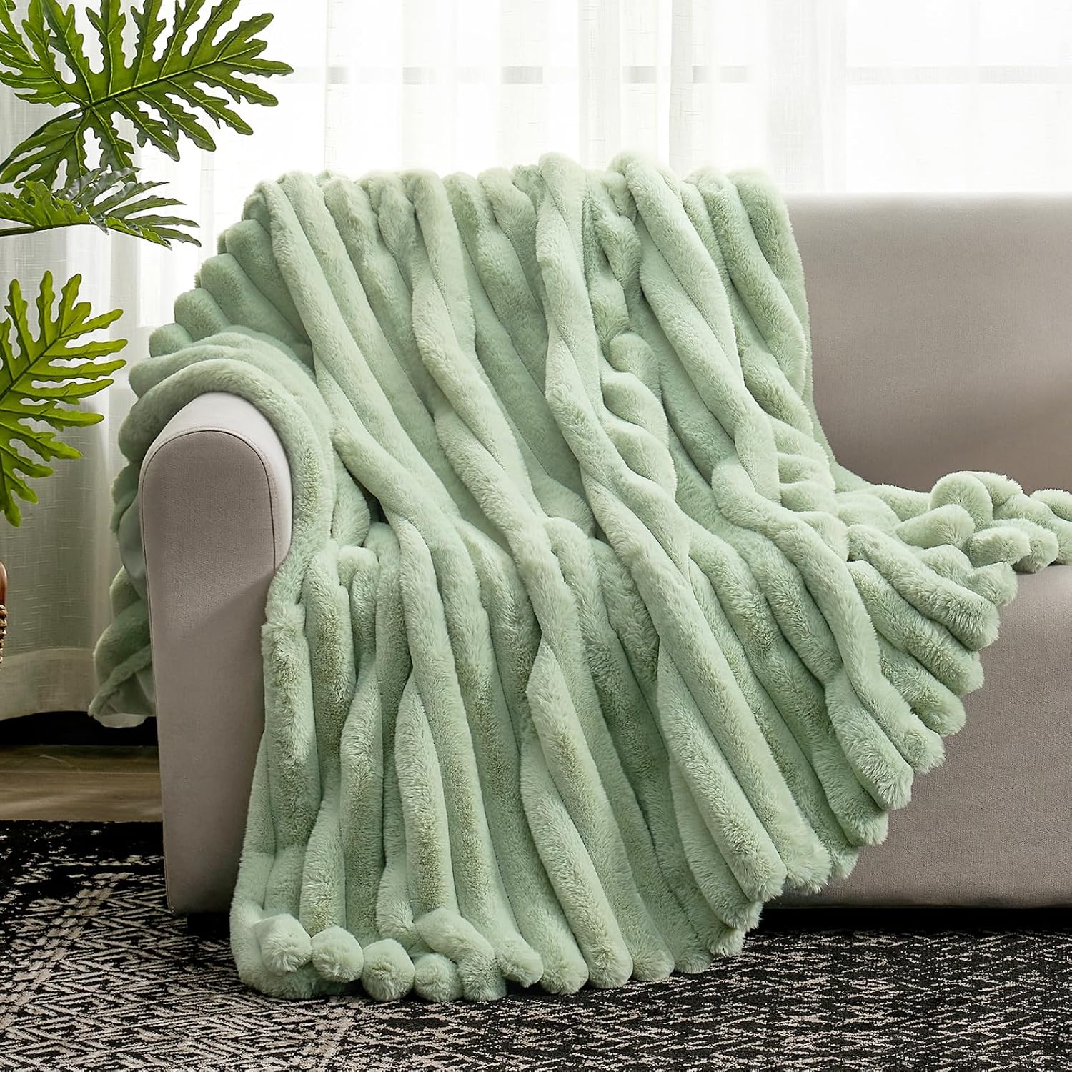 Cozy Bliss Faux Fur Throw Blanket for Couch, Cozy Warm Plush Striped Blanket for Sofa Bedroom Living Room, 60 * 80 Inches Sage Green