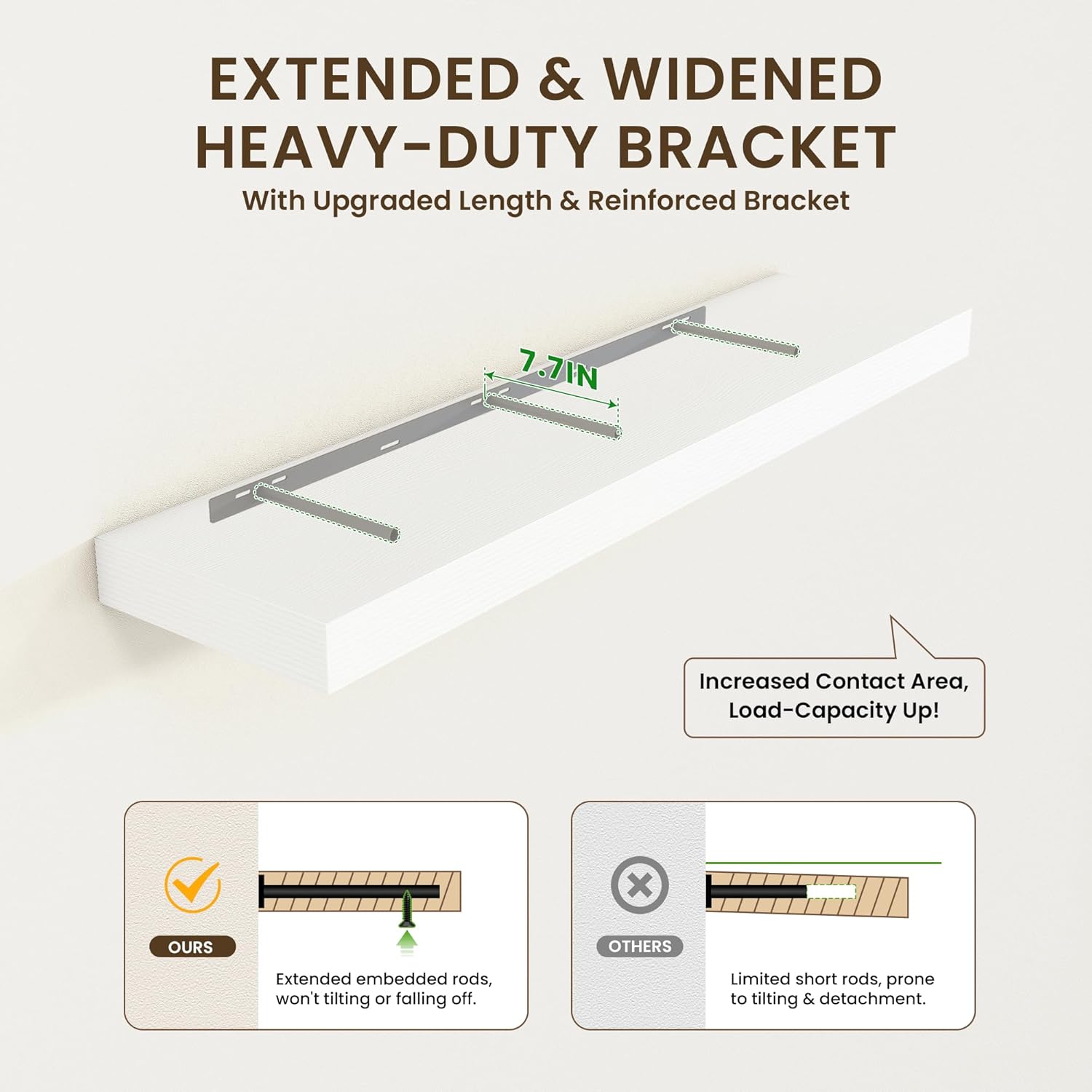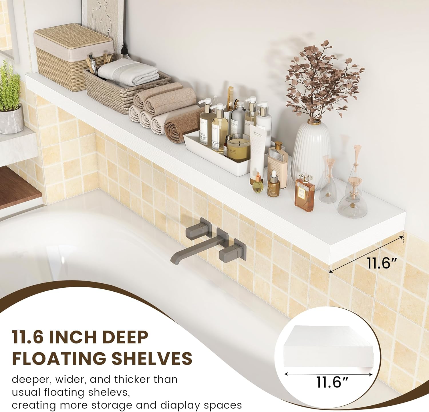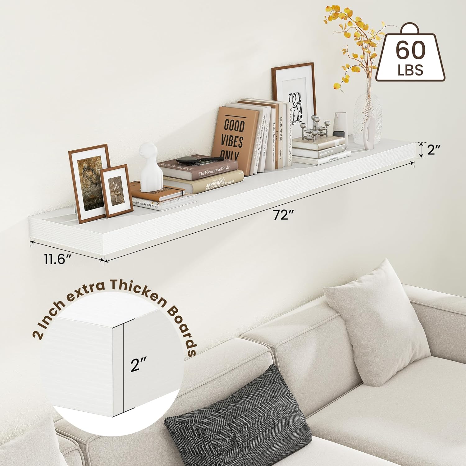 - DEEPER & THICKER SHELF- Our floating shelves measure 72W x 11.6D x 2H, deeper and thicker than usual wall shelves, which create more storage and display space for your home