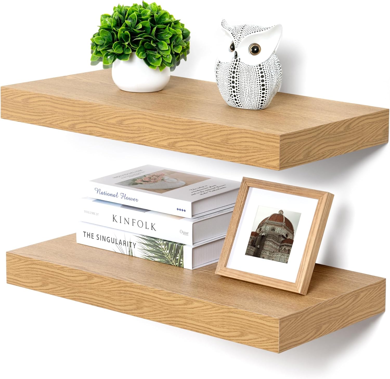 Deep Floating Shelves, 12 Inch Deep Rustic Floating Shelves Set of 2, 24 Inch Large Oak Wood Wall Mounted Shelves for Books Living Room Laundry Room Bedroom Kitchen Home Office - Oak