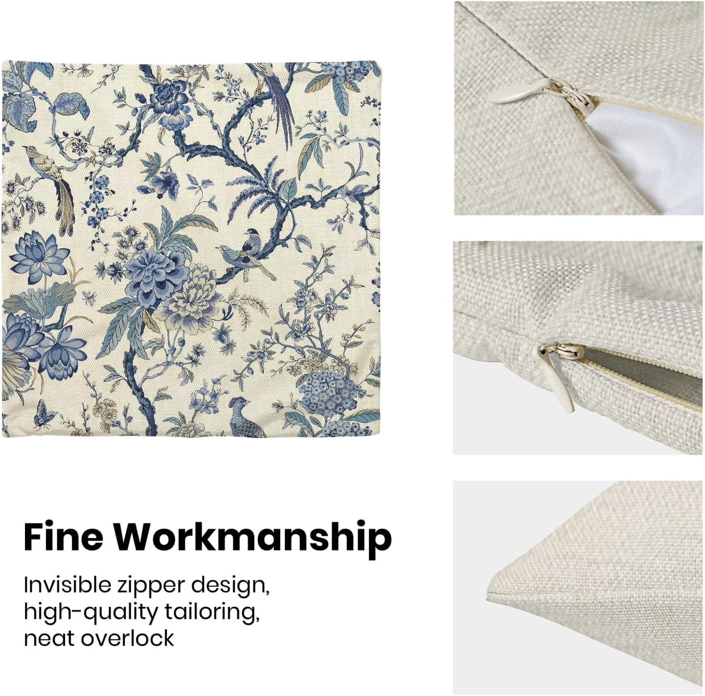 - 【Spring Pillow Covers】 Our Chinoiserie floral throw pillow covers 18x18 inch are made of excellent breathable polyester cotton fabric. The blue and white floral decorative pillow covers is durable, soft and skin-friendly. The plant outdoor pillow covers adopt exquisite edging technology and four sides of our floral pillow covers are sewn firmly, which is not easy to open the line.