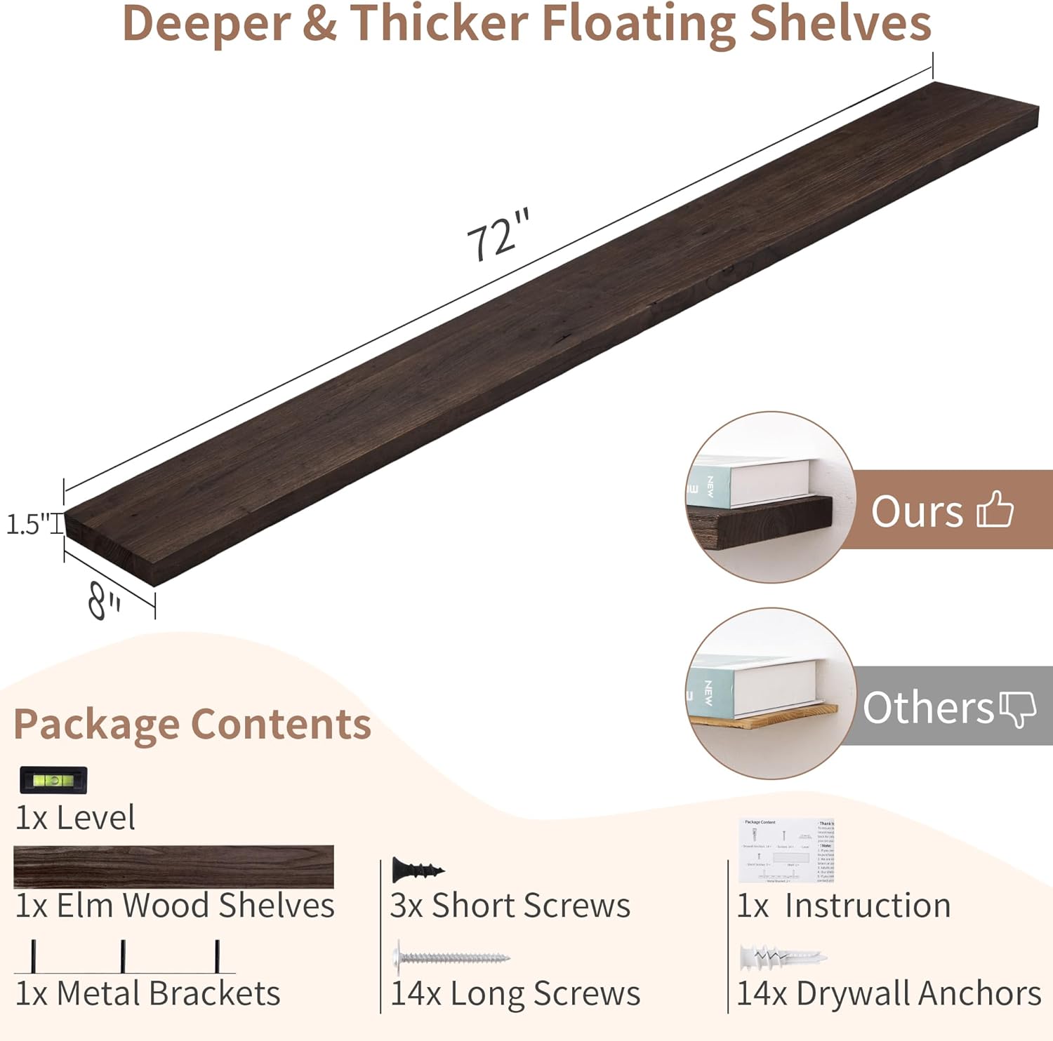 - 8" DEEP-MORE SPACE MORE TIDINESS: Axeman 72 inch floating shelves are designed to be deeper and thicker than traditional floating shelves, with a thickness of 1.37 inches and a depth of 8 inches. You can display a variety of items, such as photos, books, and knickknacks on these sturdy and spacious natural wood floating shelves