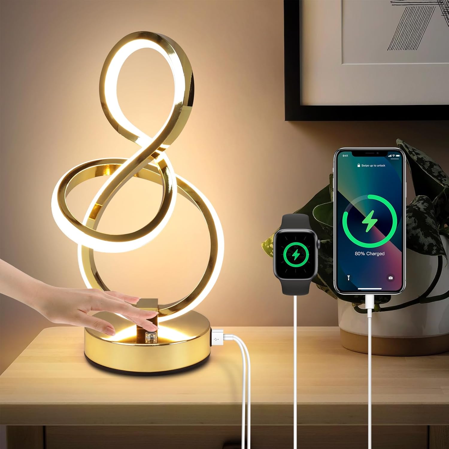 Modern Table Lamp, LED Bedside lamp with USB C+A ports, Touch Stepless Dimmable Nightstand lamp, Unique Spiral Table lamp for Bedroom Living Room Home Office, Spiral lamp for Ideal Gift, Gold