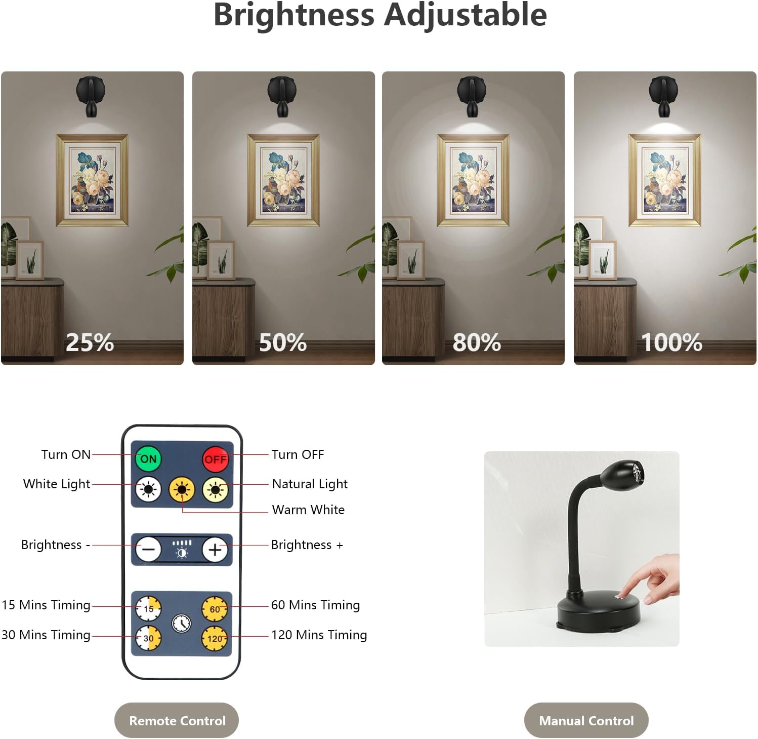 Cordless Spotlight Battery Operated, LED Picture Light, Dimmable Accent Light with Remote, Indoor Stick on Display Lamp for Plant Tree Photo Dartboard Painting Artwork Portrait