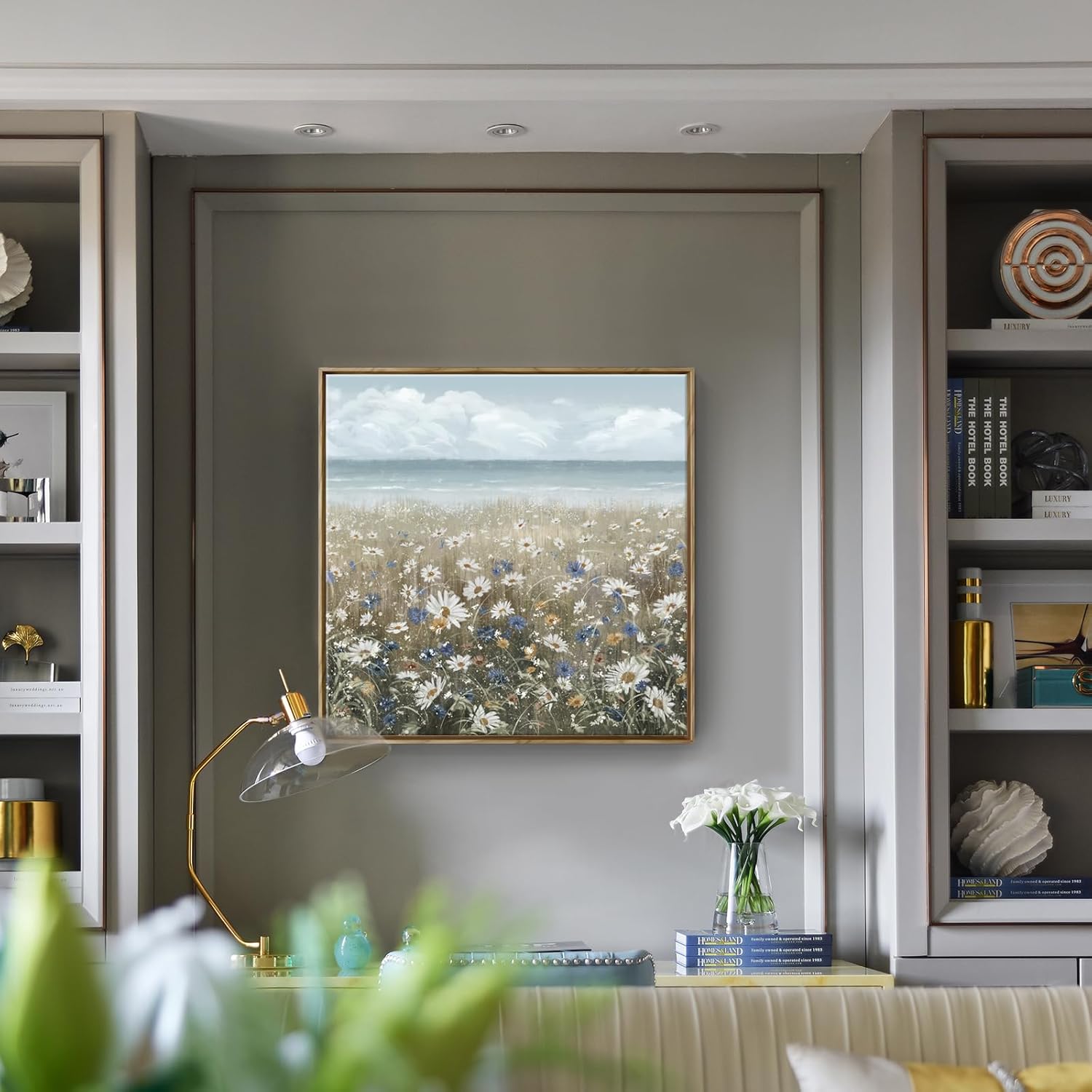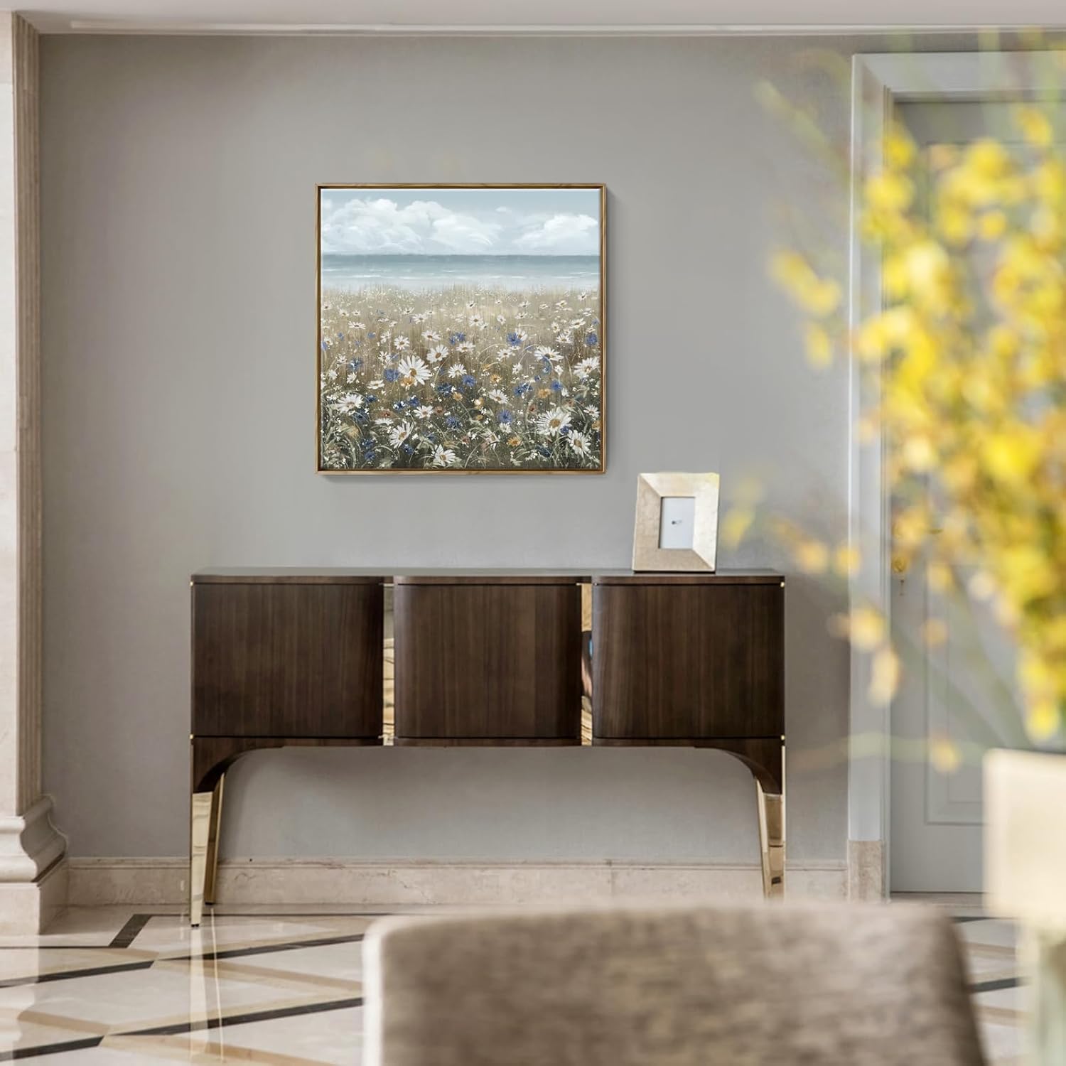 - ➤Bring a Beach Vibe to Your Space: This floral wall picture depicts a seashore covered with newly blooming wildflowers Daisy. The upper half of the flower wall art features a blue sky and a calm ocean in pale blue and grey tones for a fresh and breezy look. The lower half of the artwork is covered in a neutral palette of white, cream, and brown to complete this coastal farmhouse piece.