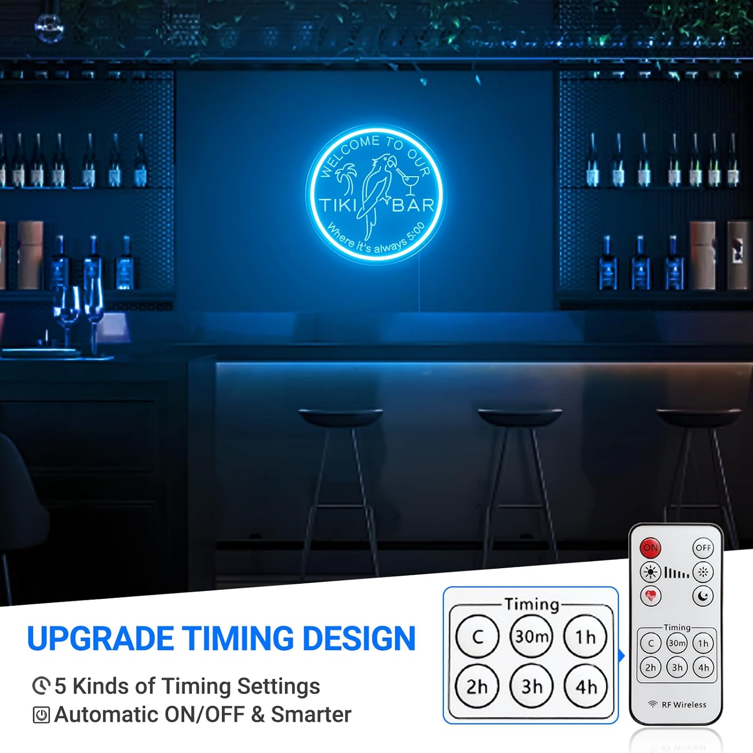 - ⏰【Original Timing Function】The tiki bar neon light adopts the latest timing control design with 5 timing modes of 0.5 H/1 H/2 H/3 H/4 H. It also has stepless dimmable mode and multiple dimming modes. You can arbitrarily adjust the brightness and set the mood for any occasion, whether it's a romantic bistro, a party, or just relaxing at home. More convenient & save energy.
