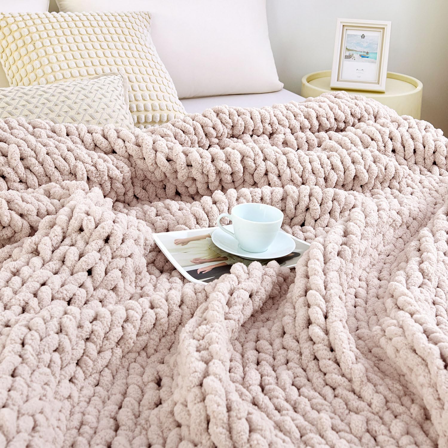 Admitrack Chunky Knit Blanket Throw, 100% Hand Knit Chenille Throw Blanket for Sofa & Home Decor, Soft and Cozy Knitted Throw Blankets (Pink,51"x63")