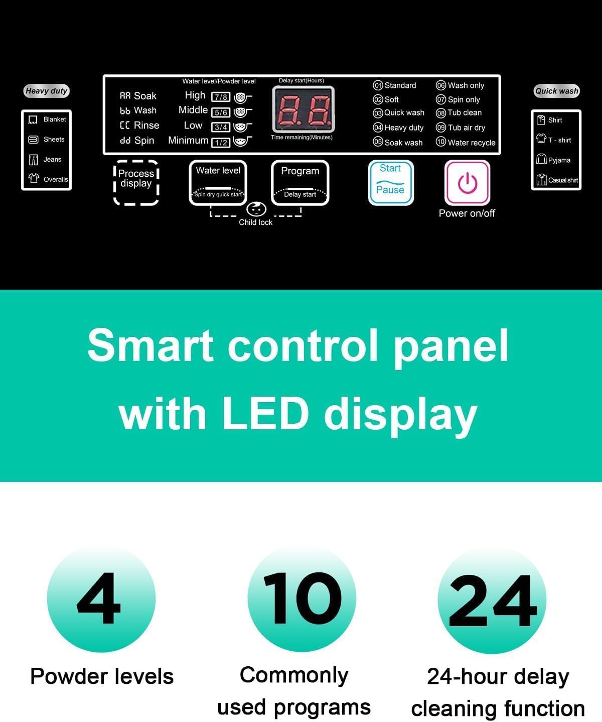 - 👖【Multifunctional Control Panel 】This portable washer has 10 programs and 8 water levels with clear instructions for all functions and operations. You can easily choose the appropriate program and water level to meet your needs. Just load your dirty laundry, add water, choose a washing program, and start washing in no time!