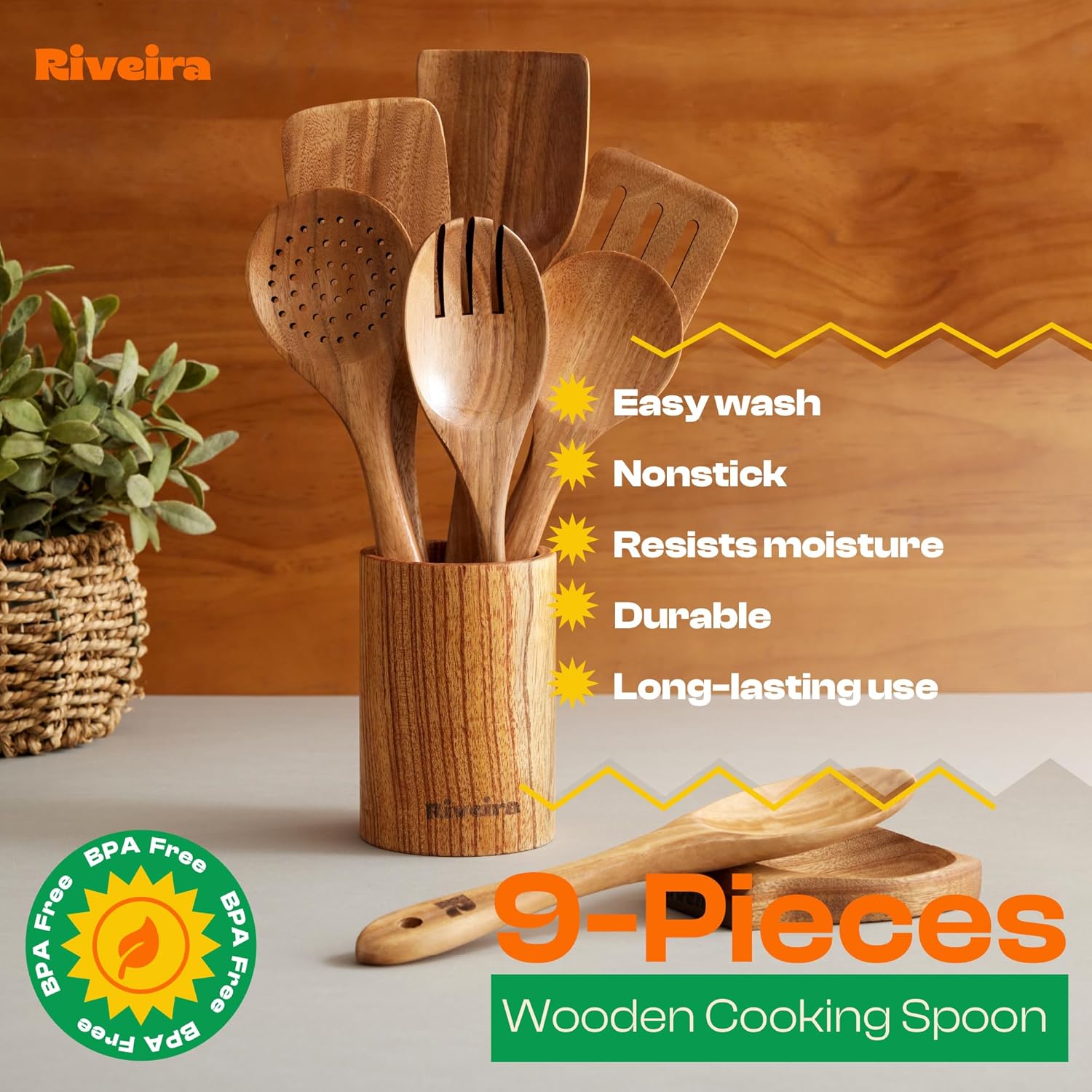 Riveira 9 Pieces Teak Wooden Spoons For Cooking – Premium & Durable Organic Teak Wooden Cooking Utensils – Non Stick Wooden Spatula For Cooking – Non Toxic Utensil Set With Holder & Spoon Rest