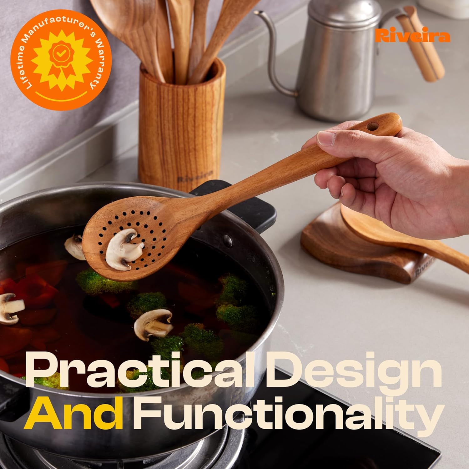 - Heat-Resistant & Non-Scratch Performance — Experience superior heat resistance with our teak wooden spoons for cooking set. Unlike rubber kitchen utensils, these wooden spoon set won't melt or deform at high temperatures. Enjoy the excellent heat insulation performance of these durable kitchen utensils set wood, preventing hand burns during cooking. Say goodbye to scratched surfaces and welcome Riveira wooden cooking spoons that care for both your cookware and your family’s safety.
