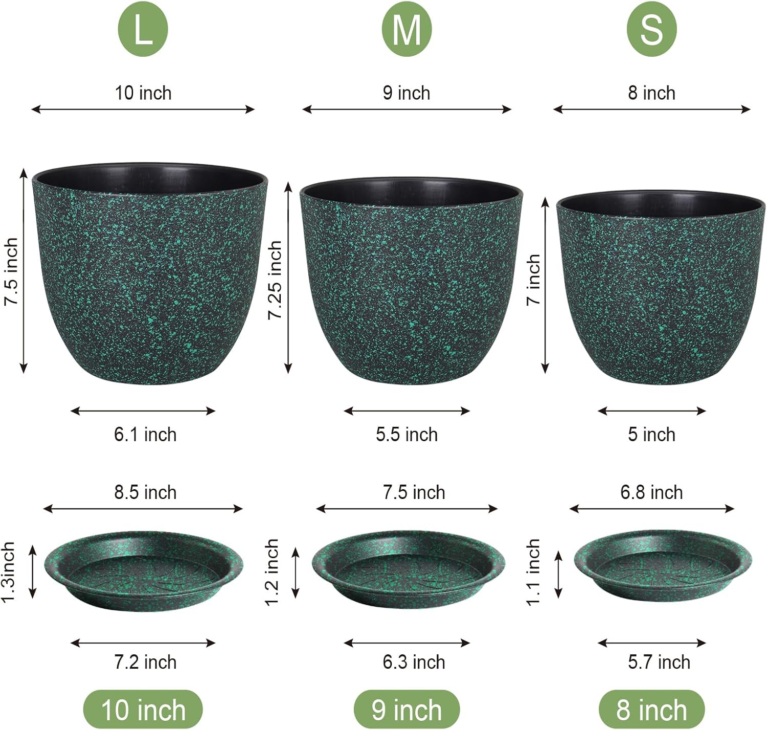 Plant Pots 10/9/8 inch, Set of 3 Modern Decorative Plastic Planters with Drainage Holes and Saucers for Garden House Plants, Flower Pots for Indoor Outdoor Plants, Black with Green Speckles