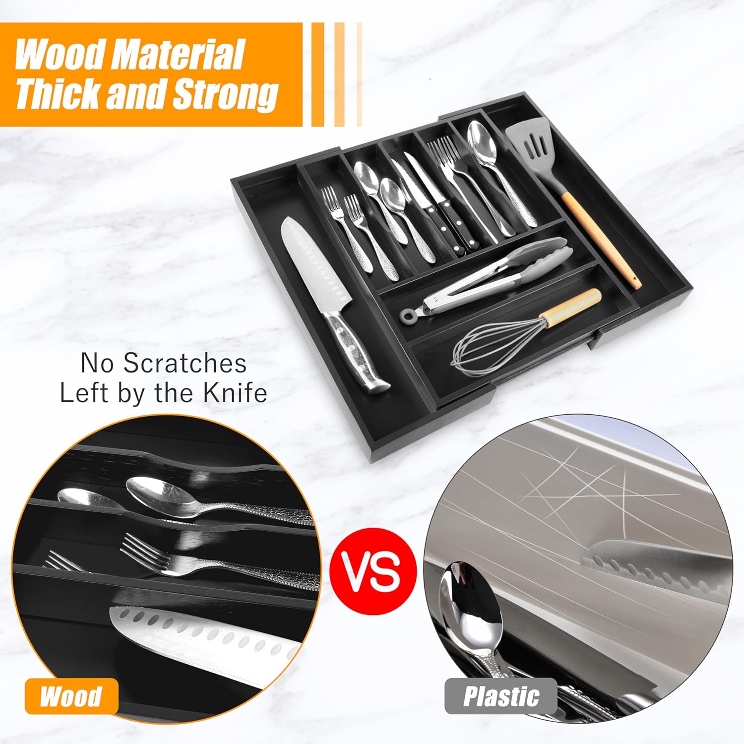 - â ăExpandable - fit most kitchen drawers.ăOur large utensil silverware drawer organizer flatware cutlery tray are adjustable in width, expanding from 17"x13" to 17"x19.6" as needed, with a depth of 1.9" . The utensil silverware drawer organizer is crafted from natural bamboo that has been grown for over 4 years. Each silverware drawer organizer made of bamboo is meticulously handcrafted by seasoned artisans to ensure a smooth, smooth surface. You can confidently allow your family or children to use our silverware drawer organizer.
