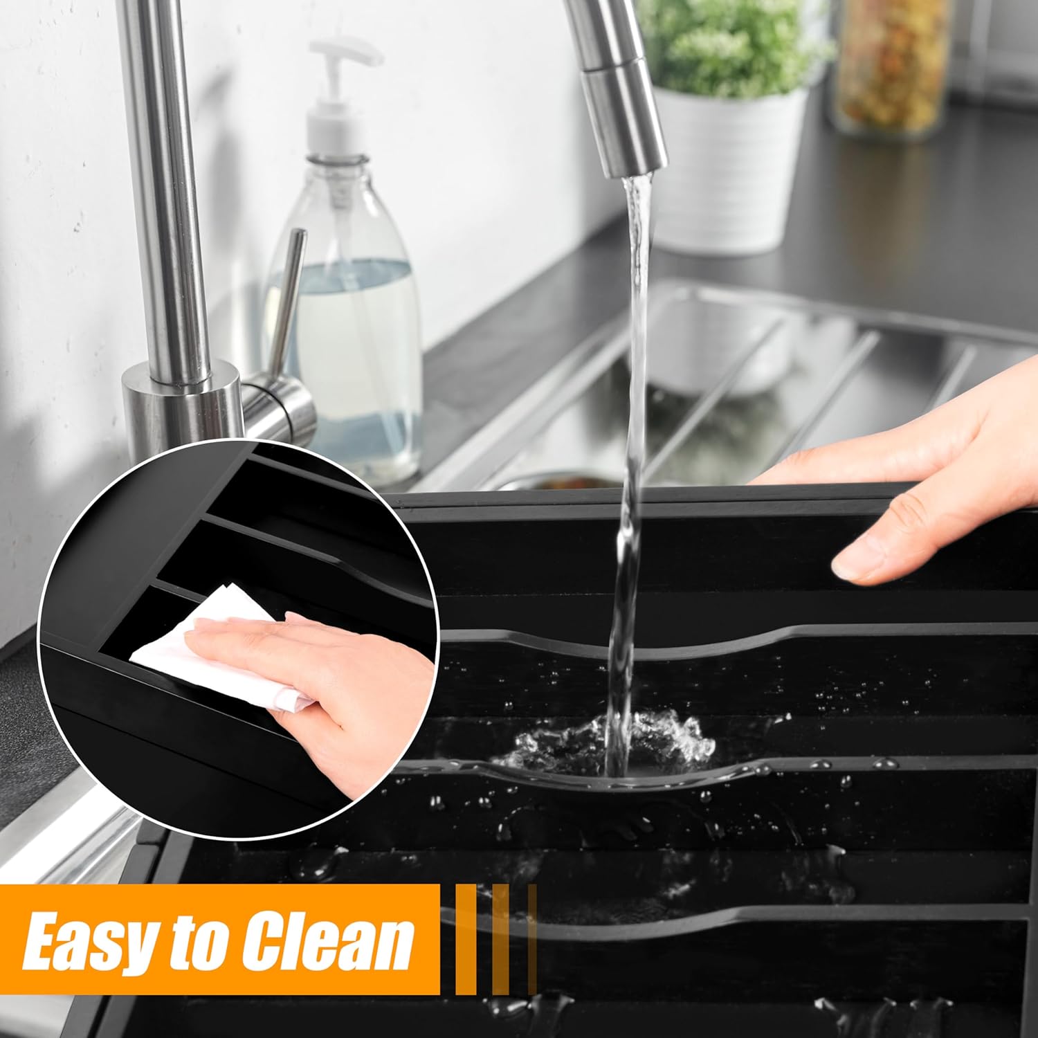 - â ăQuality - Deep Compartments & Reinforced BaseăOur utensil drawer organizer features compartments with a depth of 1.9 inches, helping maximize drawer space and perfect for storing more essential tools and gadgets. The utensil silverware drawer organizer comes with a reinforced base, ensuring durability for long-term use, and is ideal for supporting the weight of heavy-duty utensils and knives. Keep everything you need conveniently at hand while cooking, neatly visible, and easy to grasp when preparing the next meal in the kitchen.