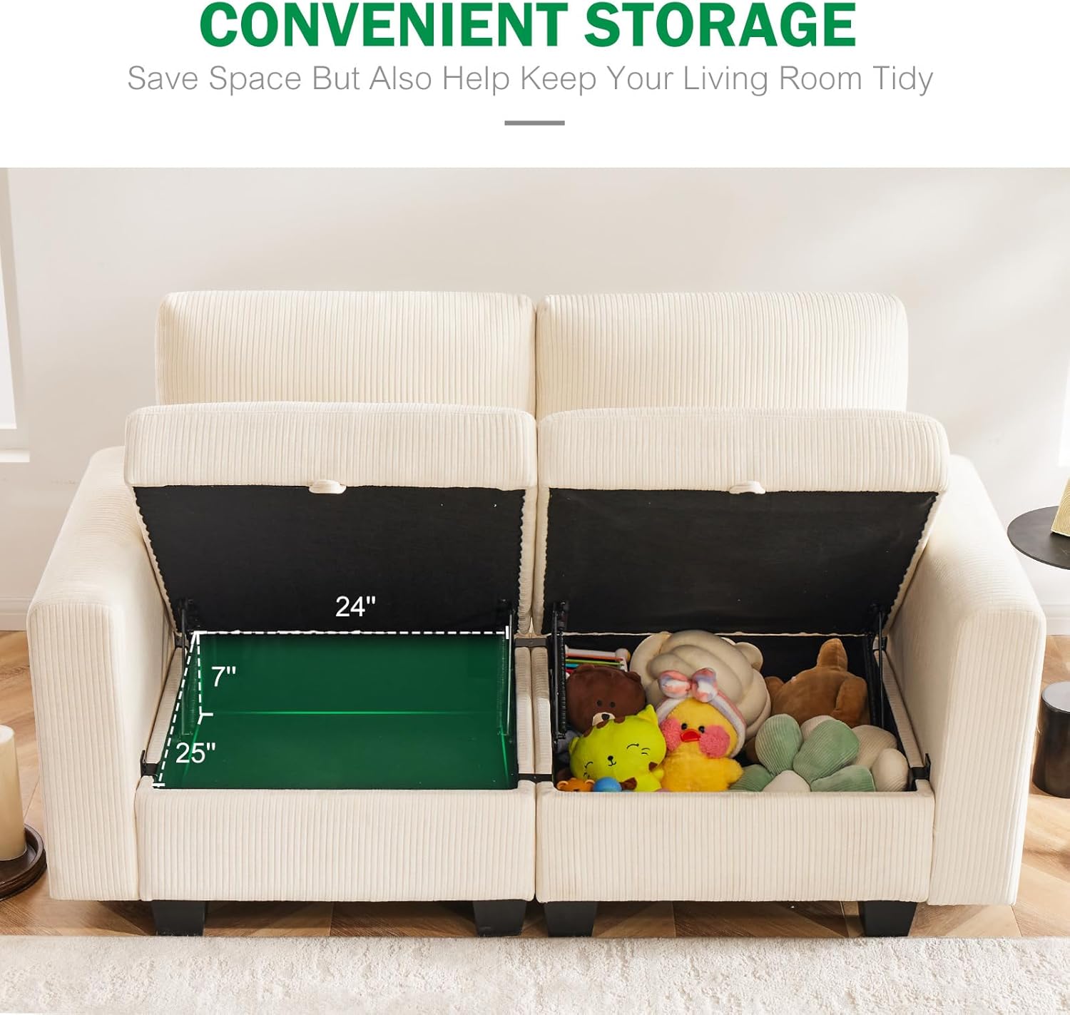 - ARMCHAIR WITH STORAGE:The modern accent chair has a hidden storage compartment large enough to hold blankets, books, cushions, CDs, or anything else you want to keep handy. This not only saves space but also helps keep your living room tidy. This multifunctional sofa can be easily rearranged to fit both small and spacious living rooms, bedrooms, playrooms, etc. Storage dimensions: 24.5''W x 25''D.