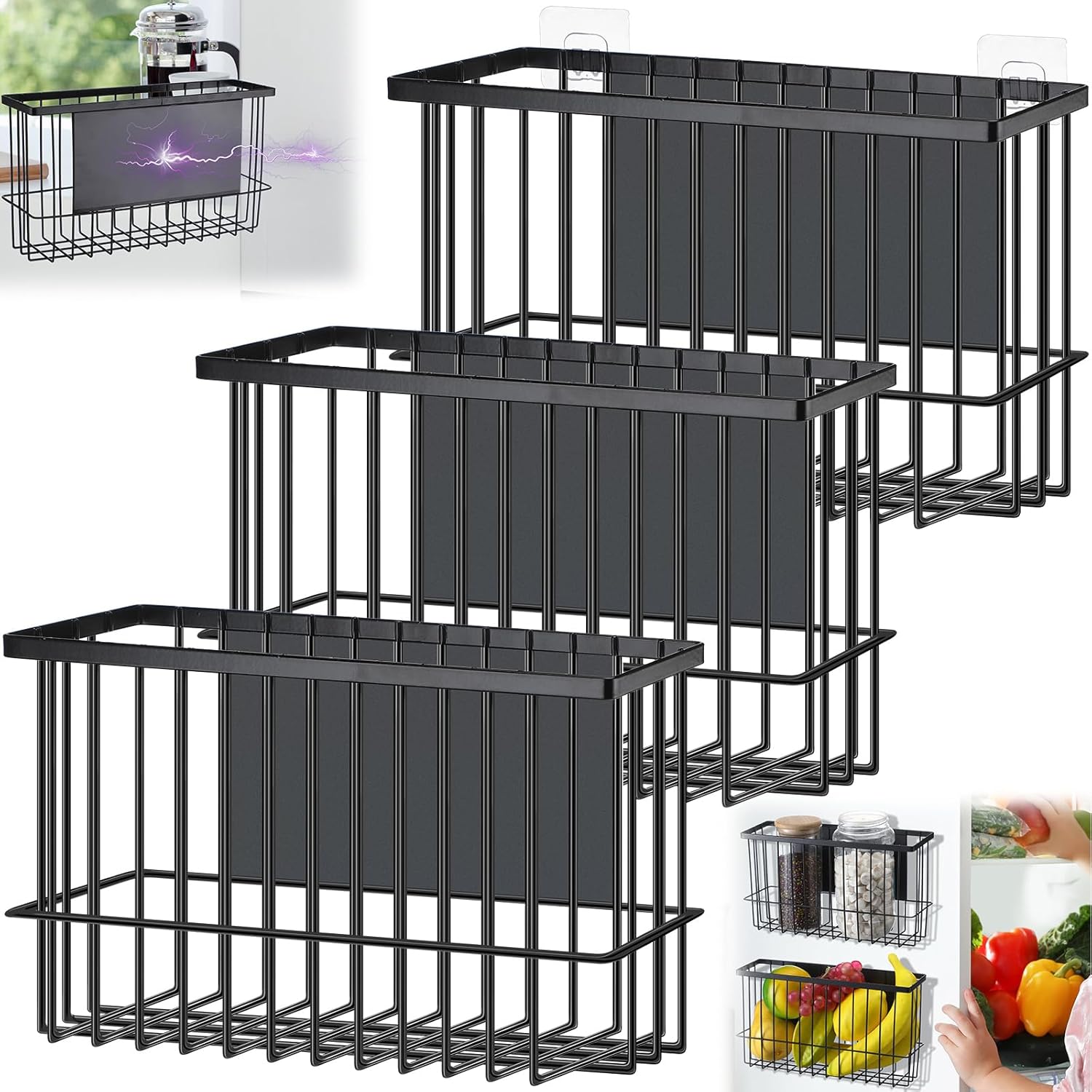 3 Pcs Magnetic or Adhesive Refrigerator Organizer Magnetic Baskets Kitchen Holder for Refrigerator Metal Shelf Rack Storage with 2 Types of Installation(Black)