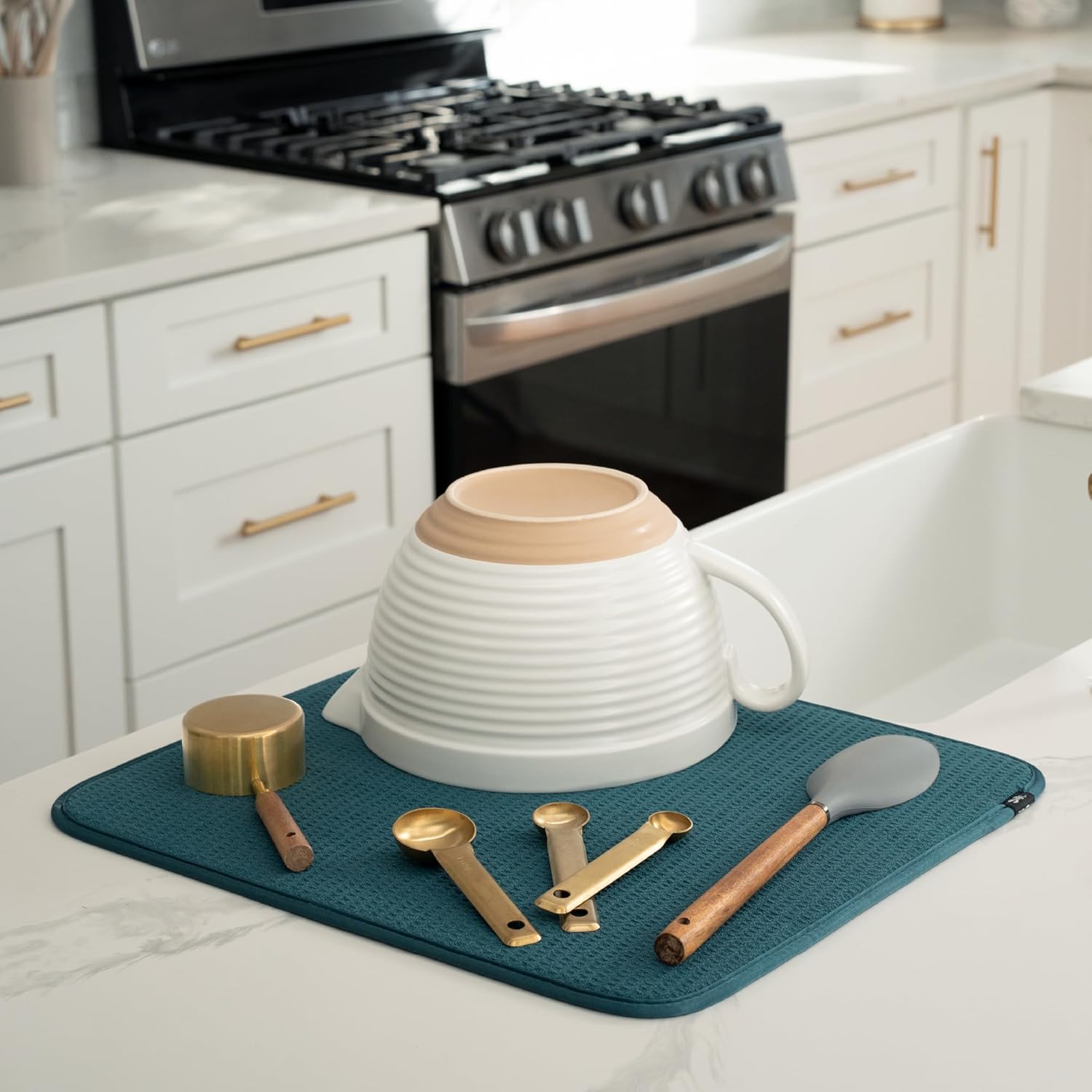 - One S&T INC. Microfiber Dish Dry Mat measuring 16 in. x 18 in.; kitchen mat for countertop absorbs up to 4 times its weight in water to keep your countertop dry, unlike a silicone dish drying mat