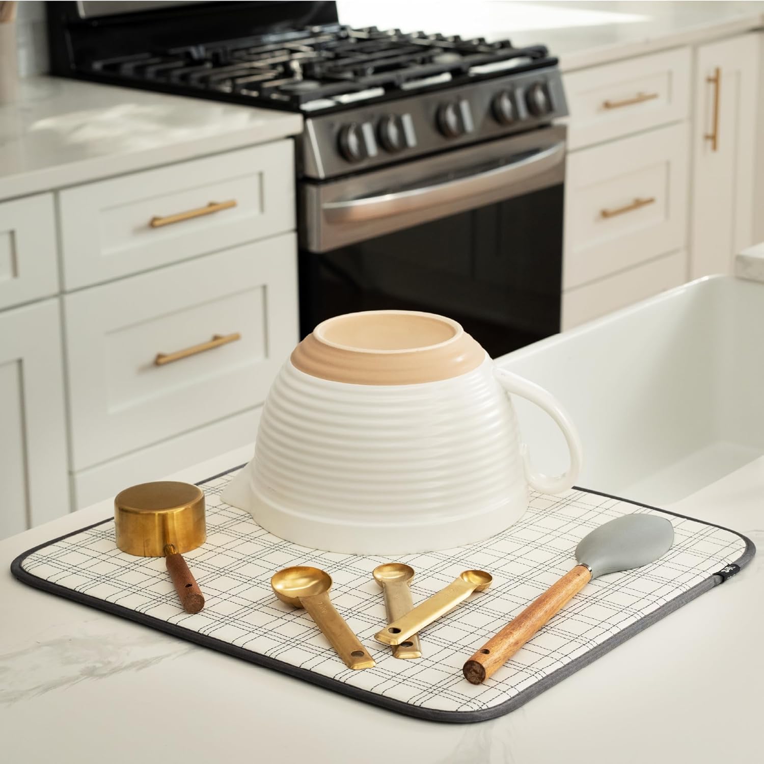 - Catch the kitchen sink drips under a dish drying rack or place your plates, forks, spoons, pots and pans set, or glassware directly on the drying mat