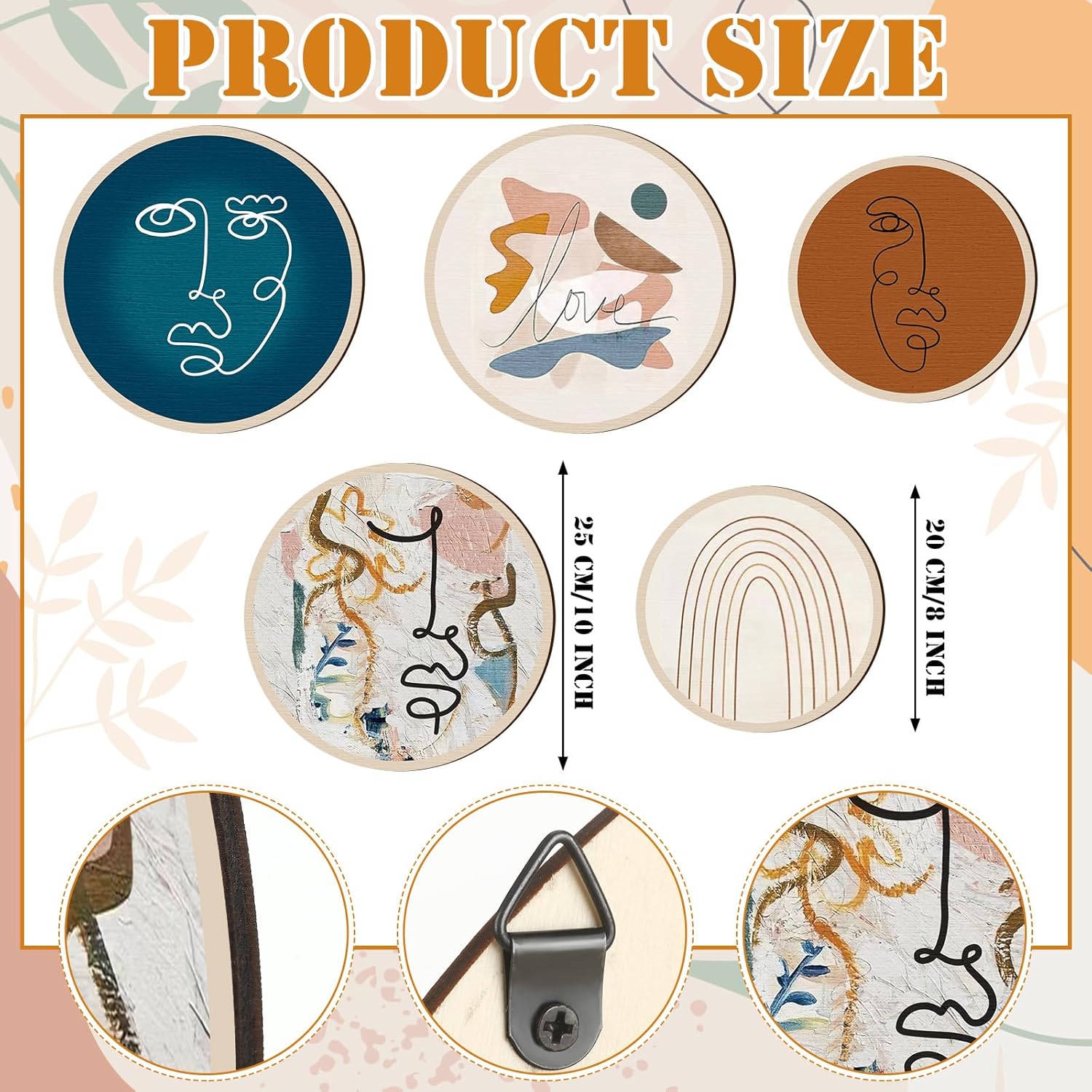 - Proper Size for Display: there are 2 kinds of sizes of the aesthetic wall art, 3 bigger ones measure about 10 inches/ 25 cm in diameter, and 2 smaller ones are about 8 inches/ 20 cm in diameter, all of them are about 0.2 inch/ 0.5 cm in thickness, proper size to catch people's attention