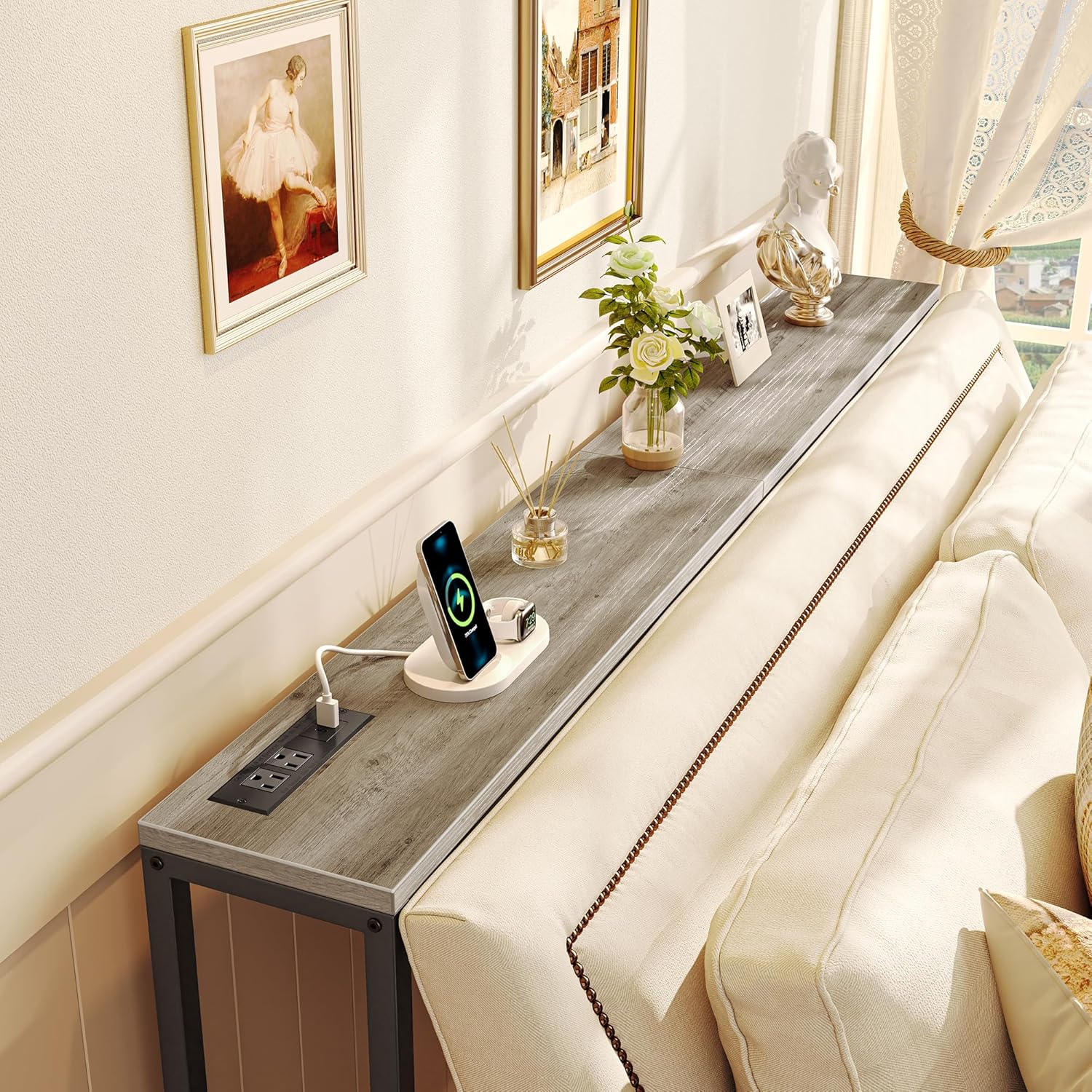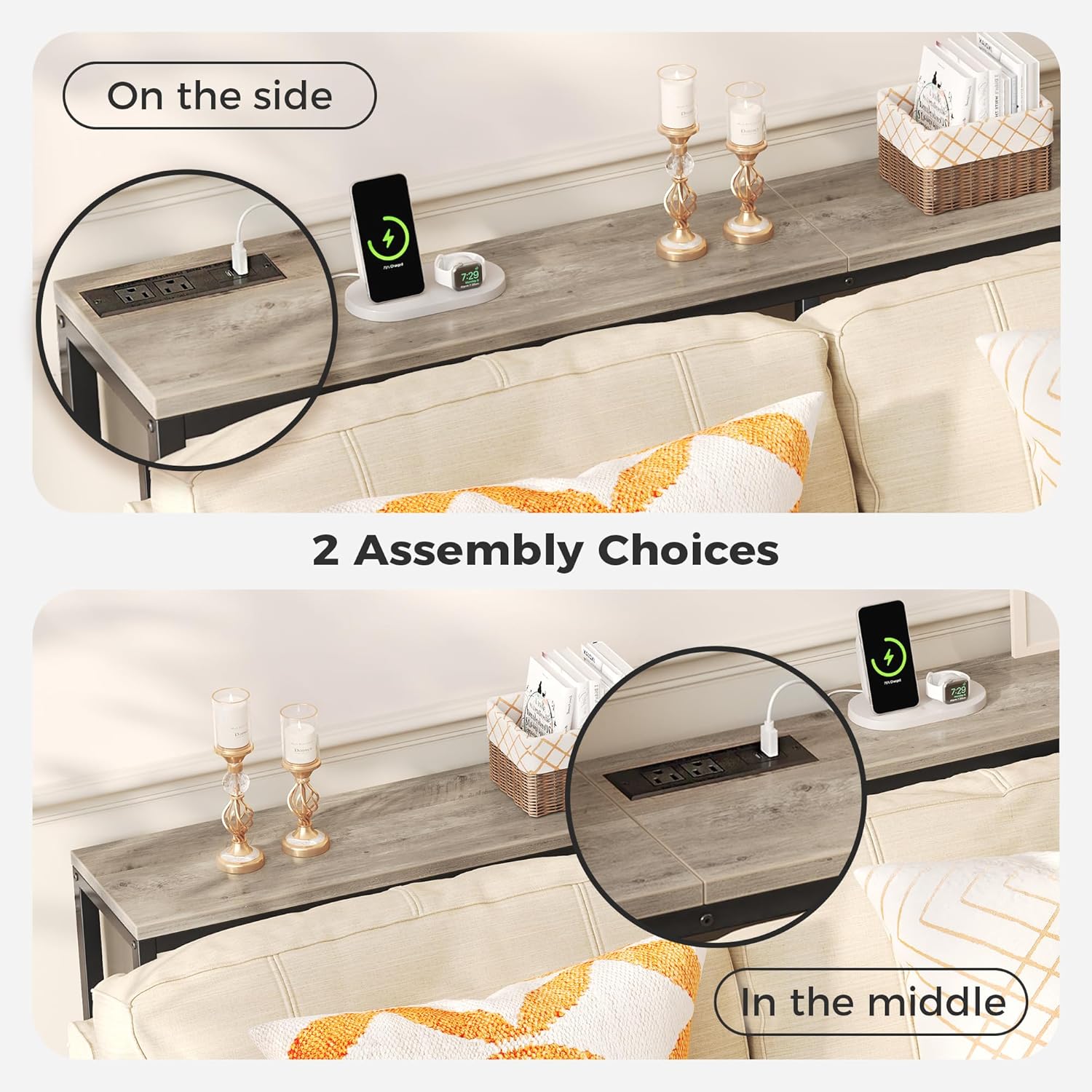 - [No Low Battery Warnings]: Imagine lounging on your sofa and brushing your phones to relax after a busy week. Donβt let low battery disappoint you. Let this sofa table narrow long with 2 AC outlets, 1 USB port and 1 type-C port provide close-at-hand power
