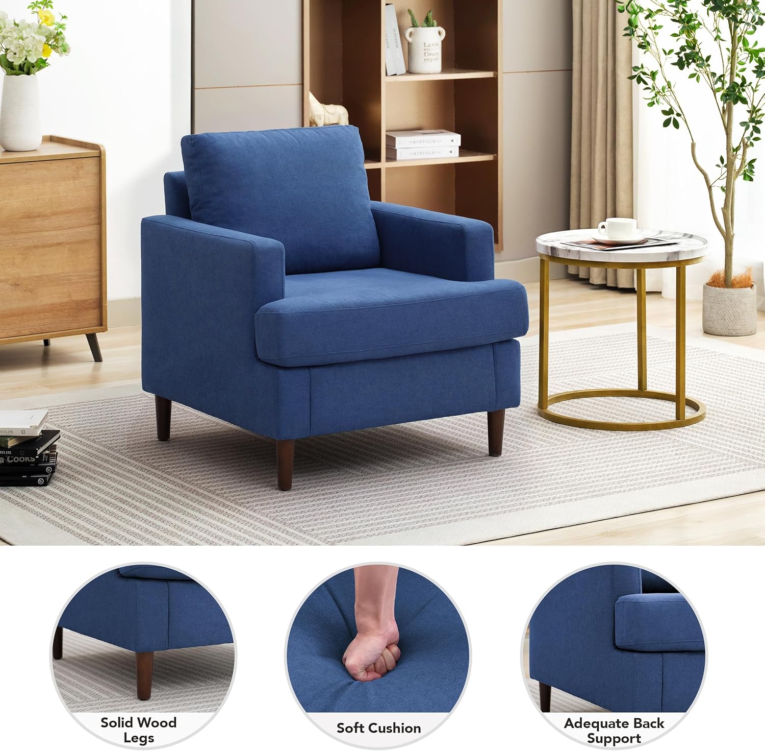Mid-Century Accent Chair,Modern Linen Fabric Armchair for Living Room,Comfy Upholstered Reading Accent Chairs for Bedroom,Single Sofa Chair with Wood Legs (Blue, 1 Pack)