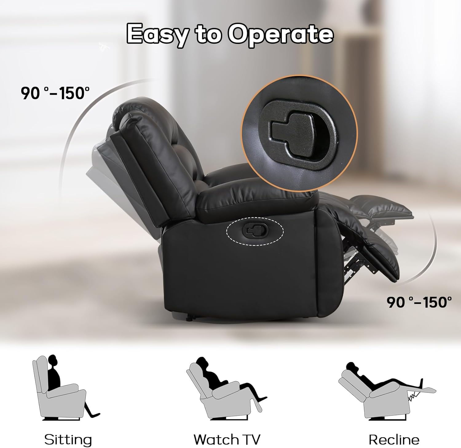 EBELLO Faux Leather Manual Recliner Chair, Single Reclining Sofa Chair Couch with 2 Concealed Cup Holders, Overstuffed Armrest Backrest for Living Room, Bedroom, Meeting Room, Black