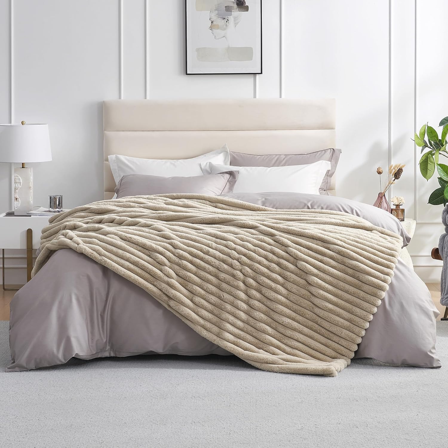 Amélie Home Faux Fur Throw Blanket for Couch, Cozy Fuzzy Fluffy Fur Luxurious Soft Striped Plush Gift Blankets for Family Sofa Chair Bed Living Room Bedroom, 60"x80", Beige