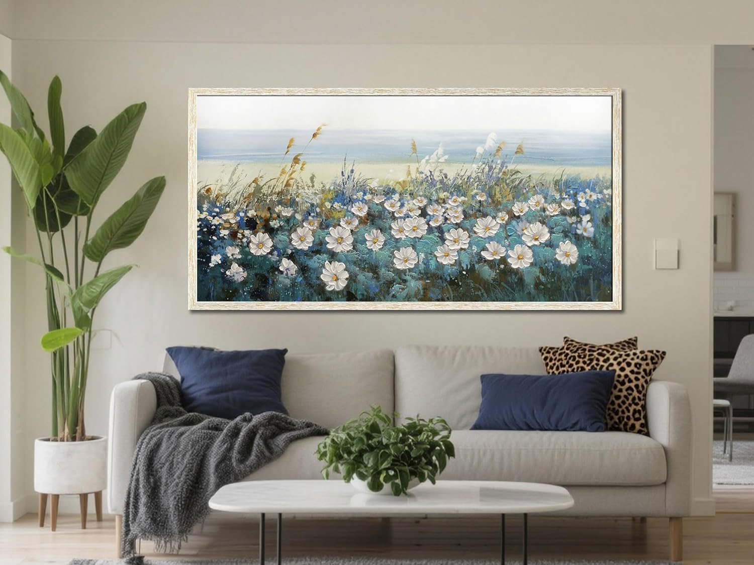 Arjun Flowers Wall Art Canvas White Daisy Floral Painting Blue Coastal Landscape Picture Modern Artwork for Living Room Bedroom Bathroom Dinning Room Office Home Wall Decor Large Framed 48"x24"