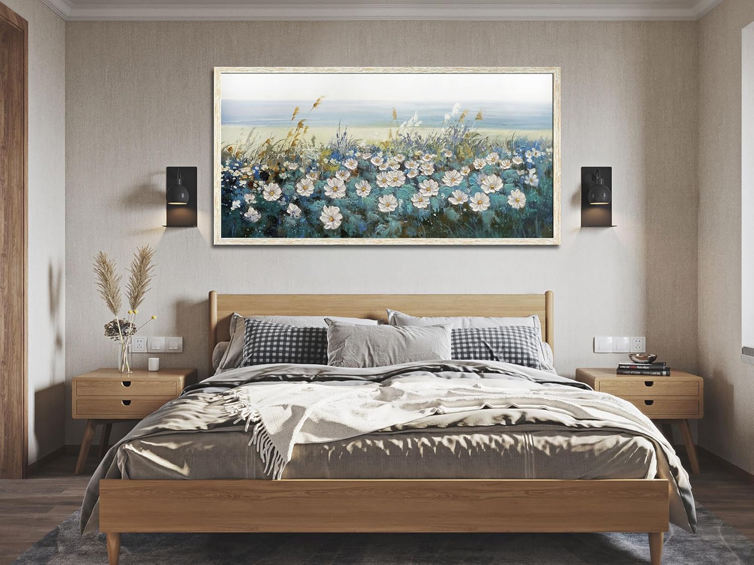 - Daisy Wall Art Size: 48inx24in(120cmx60cm), wooden framed and hook mounted ready to hang. It's our original design. The daisy is hand painted with a vibrant palette to make the painting textured.