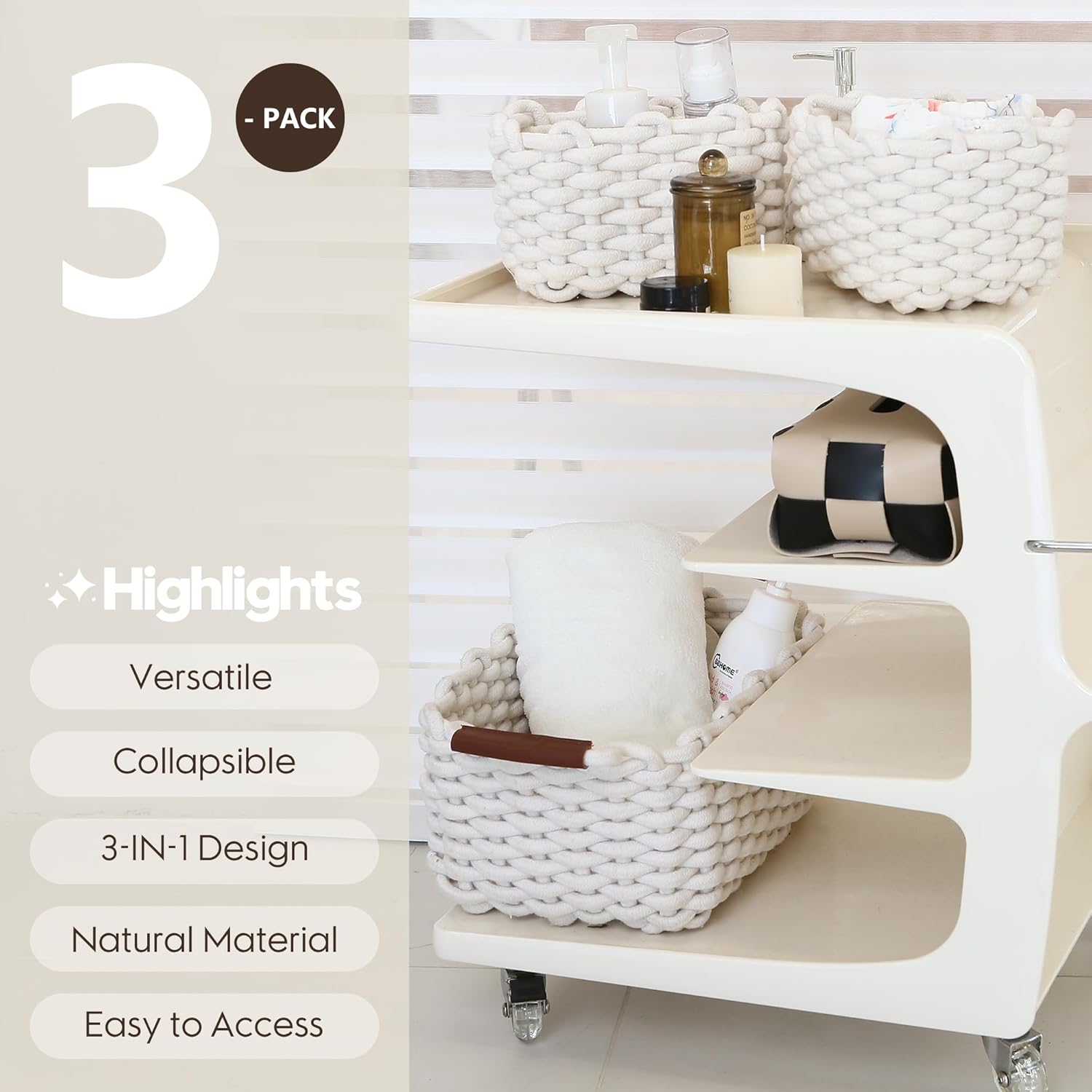 - Versatile Storage Solutions - Set of 3 storage baskets provide an efficient solution in your home, office and even trunk to meet many storage needs such as organizing underwear, socks, towels in the wardrobe, storing snacks, condiments, candies in the closet, and gathering toys, baby products, pet products, chargers, cables, etc