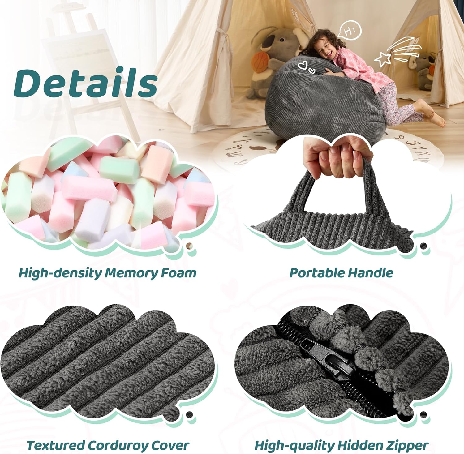 - COMFORTABLE & DURABLE FABRIC: Our bean bag chair is made of textured corduroy, which is skin-friendly. The cover can be machine washable so that you can clean it like new. The filled memory foam is high-density, which is easily rebound and make you feel relaxed once you lie down or sit on the chair.