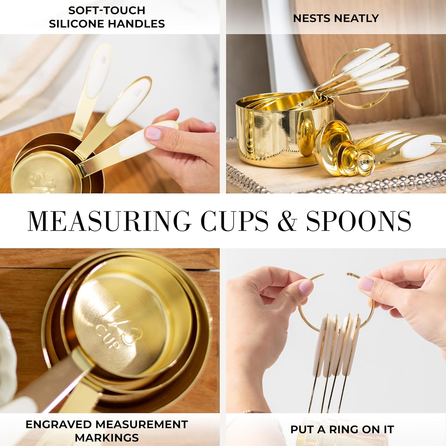 - FEEL THE QUALITY, SEE THE SPARKLE! Crafted with love from high-grade stainless steel and finished in stunning gold, these white and gold utensils set and gold measuring cups and spoons set are built to last and designed to impress. Each piece feels as good as it looks—sturdy, stylish, and just a bit show-offy. Ready to upgrade? Dive into a set that blends beauty with beast-mode durability, and make your kitchen the envy of every home chef!