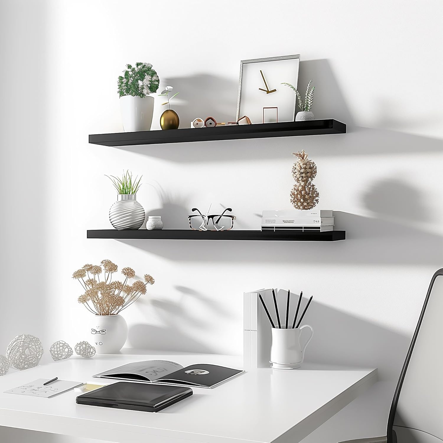 - Home decor and storage shelves - This wall shelves are the perfect piece for any rustic, modern, or natural home decor. They allow to better organize spaces, helping you conveniently store everything from alarm clocks, books, pictures to potted plants.