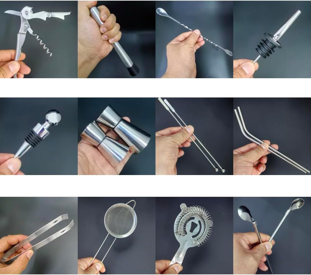 - 22-Piece Bartender Tool Kit Includes:1*25/20oz Shaker Cup,1*25/50ml Jigger,1*15/30ml Jigger,1*ice Strainer, 1*colander, 1*ice tongs, 1*muddler, 1*fork&spoon, 1*corkscrew, 2*mixing rod, 2*straw spoon, 2*curved straw, 4*pourer, 2*wine stopper, 1*Recipes Booklet, 1*black arylic stand.