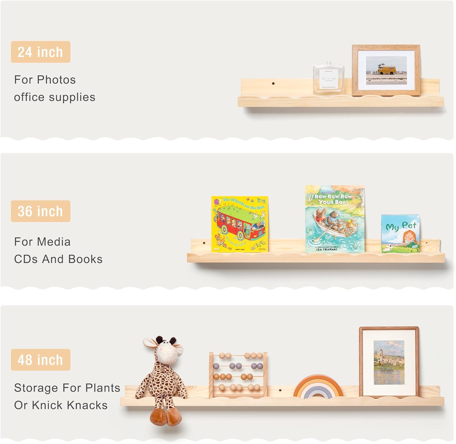 - ăLarge Storage Space Nursery ShelvesăEnhance your nursery space with these versatile floating ledge shelves. Kids can effortlessly store books, toys, stuffed animals, and games on these wall-mounted shelving units. Each nursery wall shelf measures 48Ă5Ă2 inches, and this set includes two packs for added convenience.
