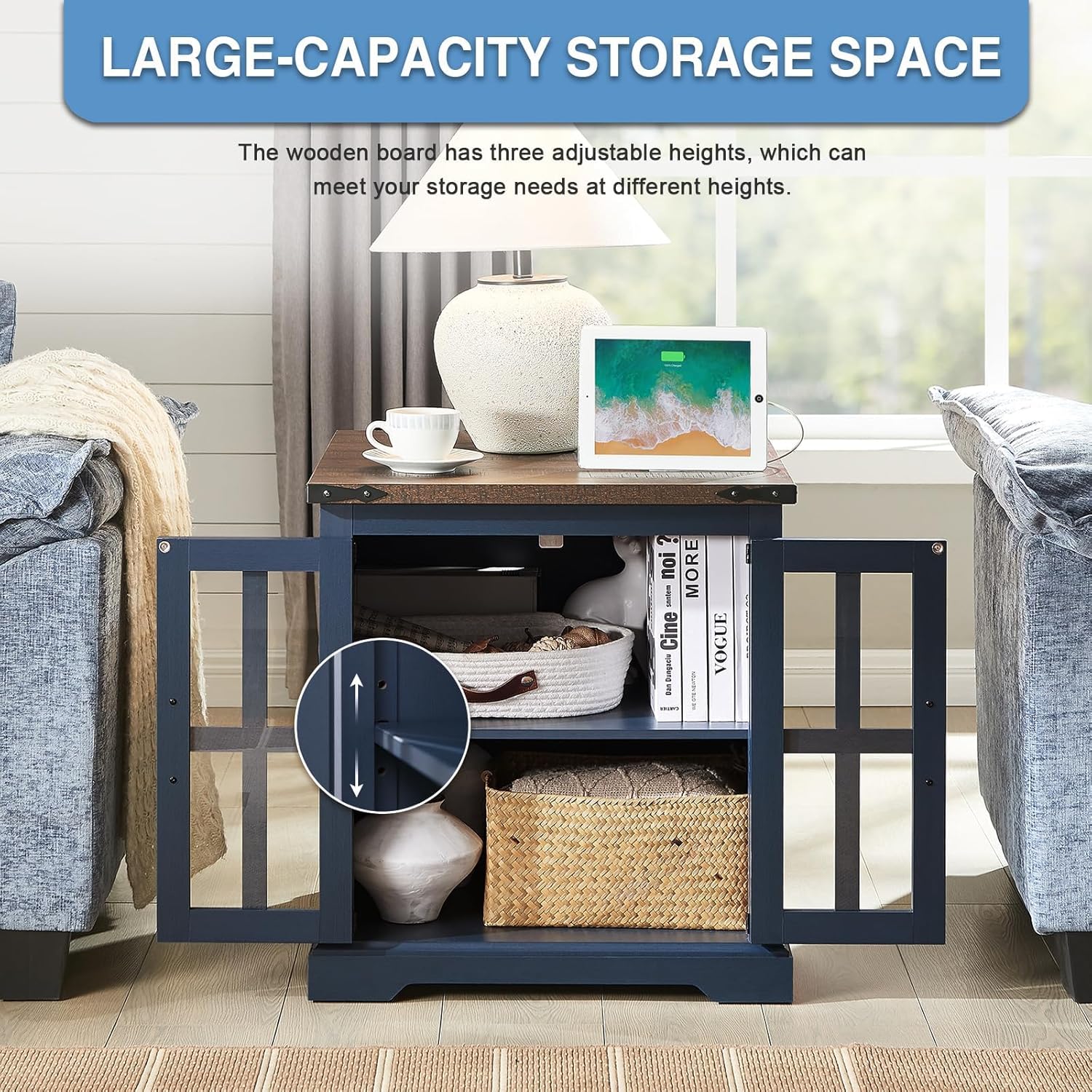 Farmhouse End Table with Charging Station,24" Large Sofa Side Table with Glass Barn Door, Rustic Wood Nightstand Bedside Table with Adjustable Storage Shelf for Living Room, Bedroom, Blue