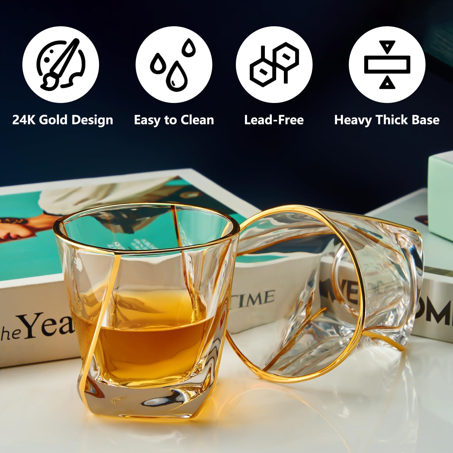 Crystal Whiskey Glasses Set of 2 with 24K Gold Rim,Bar Glasses,Twisted Whiskey Glass Gold Collection for Bourbon,Scotch and Wine,Rock Barware for Men Gift - 8oz