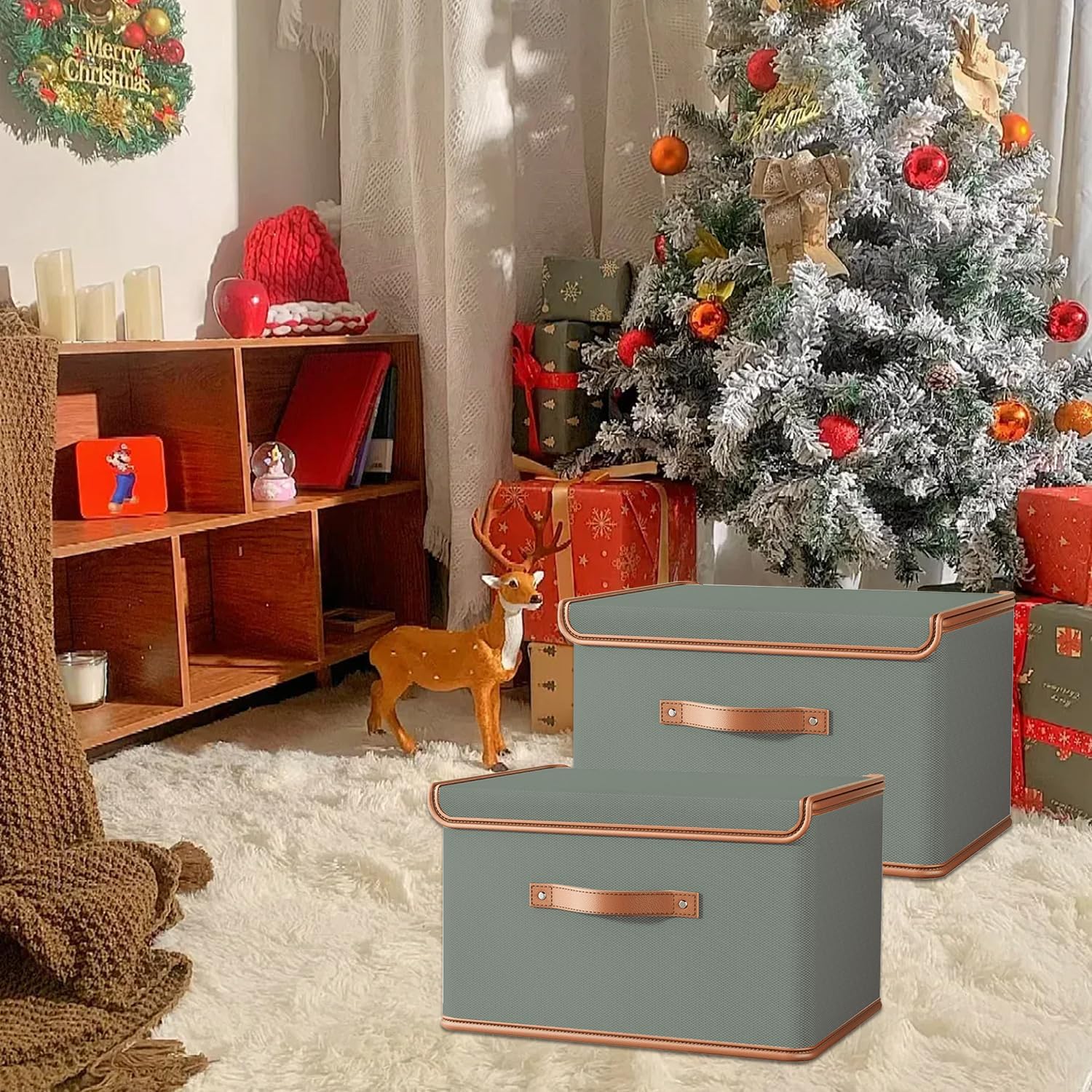 Tuza 2 Pack Storage Bins with Lids, Collapsible Closet Organizer Container, Fabric Organizer Box with Handles, Decorative Storage Boxes with Lids for Organizing Clothes, Blanket, Grey, Medium