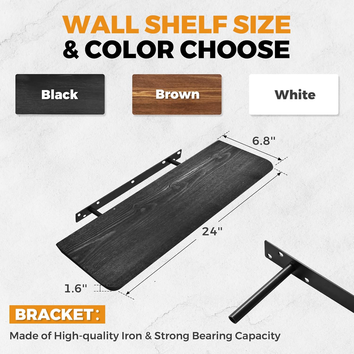 24"x6.8"x1.6" Slanted Floating Wall Shelves 2-Pack - Rustic Black Finish, Heavy-Duty Solid Wood Design with Hidden Brackets - Perfect for Living Room, Kitchen, Bathroom, or Office